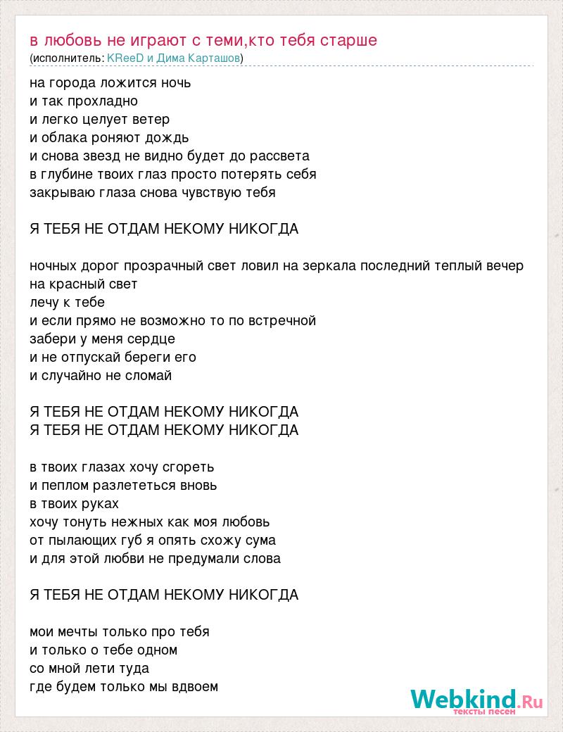 на города ложится ночь и так прохладно и легко целует ветер и облака роняют дождь и снова звезд не видно будет до рассвета в глубине твоих глаз просто потерять себя закрываю глаза снова чувствую тебя Я ТЕБЯ НЕ ОТДАМ НЕКОМУ НИКОГДА ночных дорог прозрачный свет ловил на зеркала последний теплый вечер на красный свет лечу к тебе и если прямо не возможно то по встречной забери у меня сердце и не отпускай береги его и случайно не сломай Я ТЕБЯ НЕ ОТДАМ НЕКОМУ НИКОГДА Я ТЕБЯ НЕ ОТДАМ НЕКОМУ НИКОГДА в твоих глазах хочу сгореть и пеплом разлететься вновь в твоих руках хочу тонуть нежных как моя любовь от пылающих губ я опять схожу сума и для этой любви не предумали слова Я ТЕБЯ НЕ ОТДАМ НЕКОМУ НИКОГДА мои мечты только про тебя и только о тебе одном со мной лети туда где будем только мы вдвоем