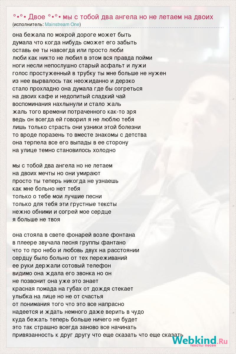 она бежала по мокрой дороге может быть думала что когда нибудь сможет его забыть оставь ее ты навсегда или просто люби люби как никто не любил в этом вся правда пойми ноги несли непослушно старый асфальт и лужи голос простуженный в трубку ты мне больше не нужен из нее вырвалось так неожиданно и дерзко стало прохладно она думала где бы согреться на двоих кафе и недопитый сладкий чай воспоминания нахлынули и стало жаль жаль того времени потраченного как-то зря ведь он всегда ей говорил я не люблю тебя лишь только страсть они узники этой болезни то вроде поразень то вместе знакомы с детства она терпела все его выпады в ее сторону на улице темно становилось холодно мы с тобой два ангела но не летаем на двоих мечты но они умирают просто ты теперь никогда не узнаешь как мне больно нет тебя только о тебе мои лучшие песни только для тебя эти грустные тексты нежно обними и согрей мое сердце я больше не твоя она стояла в свете фонарей возле фонтана в плеере звучала песня группы фантано что то про небо и любовь двух на расстоянии сердцу было больно от тех переживаний ее руки держали сотовый телефон видимо она ждала его звонка но он не позвонит она уже это знает красная помада на губах от дождя стекает улыбка на лице но не от счастья от понимания того что это все напрасно надеется и ждать немного даже верить в чудо куда бежать теперь больше ничего не будет это так страшно всегда заново все начинать привязанность к друг другу что еще сказать что еще сказать