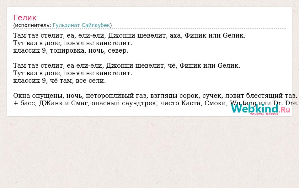Там таз стелит, еа, ели-ели, Джонни шевелит, аха, Финик или Gелик. Тут ваз в деле, понял не канетелит. классик 9, тонировка, ночь, север. Там таз стелит, еа ели-ели, Джонни шевелит, чё, Финик или Gелик. Тут ваз в деле, понял не канетелит. классик 9, чё там, все сели. Окна опущены, ночь, неторопливый газ, взгляды сорок, сучек, ловит блестящий таз. + басс, ДЖанк и Смаr, опасный саундтрек, чисто Каста, Смоки, Wu tang или Dr. Dre.