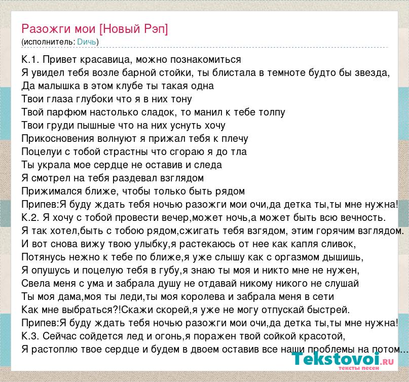 К.1. Привет красавица, можно познакомиться Я увидел тебя возле барной стойки, ты блистала в темноте будто бы звезда, Да малышка в этом клубе ты такая одна Твои глаза глубоки что я в них тону Твой парфюм настолько сладок, то манил к тебе толпу Твои груди пышные что на них уснуть хочу Прикосновения волнуют я прижал тебя к плечу Поцелуи с тобой страстны что сгораю я до тла Ты украла мое сердце не оставив и следа Я смотрел на тебя раздевал взглядом Прижимался ближе, чтобы только быть рядом Припев:Я буду ждать тебя ночью разожги мои очи,да детка ты,ты мне нужна! К.2. Я хочу с тобой провести вечер,может ночь,а может быть всю вечность. Я так хотел,быть с тобою рядом,сжигать тебя взгядом, этим горячим взглядом. И вот снова вижу твою улыбку,я растекаюсь от нее как капля сливок, Потянусь нежно к тебе по ближе,я уже слышу как с оргазмом дышишь, Я опушусь и поцелую тебя в губу,я знаю ты моя и никто мне не нужен, Свела меня с ума и забрала душу не отдавай никому никого не слушай Ты моя дама,моя ты леди,ты моя королева и забрала меня в сети Как мне выбраться?!Скажи скорей,я уже не могу отпускай быстрей. Припев:Я буду ждать тебя ночью разожги мои очи,да детка ты,ты мне нужна! К.3. Сейчас сойдется лед и огонь,я поражен твой сойкой красотой, Я растоплю твое сердце и будем в двоем оставив все наши проблемы на потом...