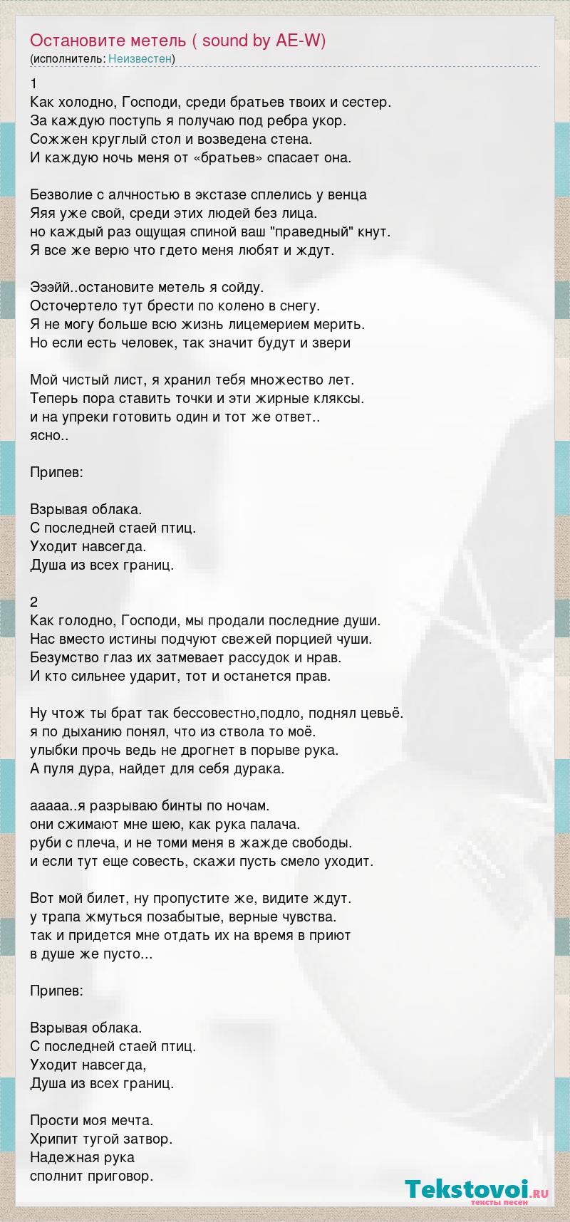 1 Как холодно, Господи, среди братьев твоих и сестер. За каждую поступь я получаю под ребра укор. Сожжен круглый стол и возведена стена. И каждую ночь меня от «братьев» спасает она. Безволие с алчностью в экстазе сплелись у венца Яяя уже свой, среди этих людей без лица. но каждый раз ощущая спиной ваш "праведный" кнут. Я все же верю что гдето меня любят и ждут. Эээйй..остановите метель я сойду. Осточертело тут брести по колено в снегу. Я не могу больше всю жизнь лицемерием мерить. Но если есть человек, так значит будут и звери Мой чистый лист, я хранил тебя множество лет. Теперь пора ставить точки и эти жирные кляксы. и на упреки готовить один и тот же ответ.. ясно.. Припев: Взрывая облака. С последней стаей птиц. Уходит навсегда. Душа из всех границ. 2 Как голодно, Господи, мы продали последние души. Нас вместо истины подчуют свежей порцией чуши. Безумство глаз их затмевает рассудок и нрав. И кто сильнее ударит, тот и останется прав. Ну чтож ты брат так бессовестно,подло, поднял цевьё. я по дыханию понял, что из ствола то моё. улыбки прочь ведь не дрогнет в порыве рука. А пуля дура, найдет для себя дурака. ааааа..я разрываю бинты по ночам. они сжимают мне шею, как рука палача. руби с плеча, и не томи меня в жажде свободы. и если тут еще совесть, скажи пусть смело уходит. Вот мой билет, ну пропустите же, видите ждут. у трапа жмуться позабытые, верные чувства. так и придется мне отдать их на время в приют в душе же пусто... Припев: Взрывая облака. С последней стаей птиц. Уходит навсегда, Душа из всех границ. Прости моя мечта. Хрипит тугой затвор. Надежная рука сполнит приговор.