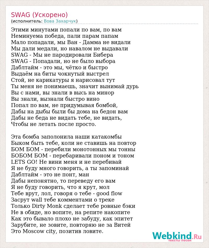Этими минутами попали по вам, по вам Неминуема победа, пали парам папам Мало попадали, мы Ван - Дамма не видали Мы дали медали, но навалом не выдавали SWAG - Мы не пародировали Бибера SWAG - Попадали, но не было выбора Даблтайм - это мы, чётко и быстро Выдаём на биты чокнутый выстрел Стой, не карикатуры я нарисовал тут Ты меня не понимаешь, значит вынимай дурь Вы с нами, вы знали в высь на минор Вы знали, вызнали быстро вино Попал по вам, не придумывая бомбой, Дабы на дыбы были бы дома на бедон вам Дабы не беда не видать тебе, не видать, Чтобы не летать после просто. Эта бомба заполонила наши катакомбы Быком быть тебе, коли не ставишь на повтор БОМ БОМ - перебили монотонных мы тонны БОБОМ БОМ - перебаривали поном и тоном LETS GO! Не вини меня и не перебивай Я не буду много говорить, а ты запоминай Даблтайм - это не понт, ман Дабы непонятно, то переведу его вам Я не буду говорить, что я крут, мол Тебе врут, лол, говоря о тебе - good flow Засрут wall тебе комментами о треке Только Dirty Monk сделает тебе ровные бэки Не в обиде, но вопите, на репите накопите Как это бывало плохо не забуду, как эпитет Зарубите, не зовите, повторяю не за Витей Это Moscow city, позитив ловите.