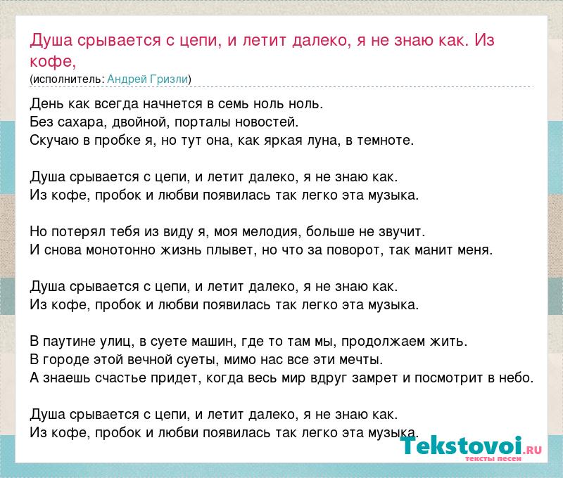 Главная→Исполнители→Андрей Гризли→Душа срывается с цепи, и летит далеко, я не знаю как. Из кофе, пробок и