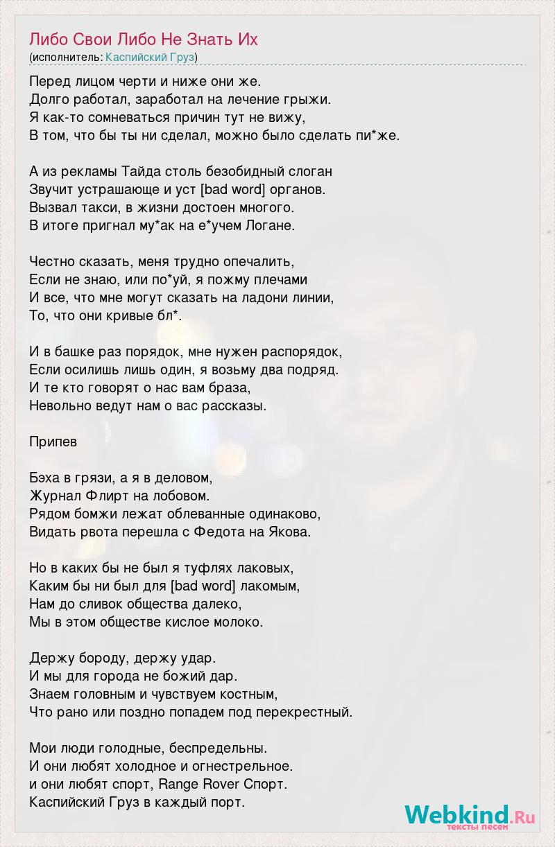 Перед лицом черти и ниже они же. Долго работал, заработал на лечение грыжи. Я как-то сомневаться причин тут не вижу, В том, что бы ты ни сделал, можно было сделать пи*же. А из рекламы Тайда столь безобидный слоган Звучит устрашающе и уст [bad word] органов. Вызвал такси, в жизни достоен многого. В итоге пригнал му*ак на е*учем Логане. Честно сказать, меня трудно опечалить, Если не знаю, или по*уй, я пожму плечами И все, что мне могут сказать на ладони линии, То, что они кривые бл*. И в башке раз порядок, мне нужен распорядок, Если осилишь лишь один, я возьму два подряд. И те кто говорят о нас вам браза, Невольно ведут нам о вас рассказы. Припев Бэха в грязи, а я в деловом, Журнал Флирт на лобовом. Рядом бомжи лежат облеванные одинаково, Видать рвота перешла с Федота на Якова. Но в каких бы не был я туфлях лаковых, Каким бы ни был для [bad word] лакомым, Нам до сливок общества далеко, Мы в этом обществе кислое молоко. Держу бороду, держу удар. И мы для города не божий дар. Знаем головным и чувствуем костным, Что рано или поздно попадем под перекрестный. Мои люди голодные, беспредельны. И они любят холодное и огнестрельное. и они любят спорт, Range Rover Спорт. Каспийский Груз в каждый порт.
