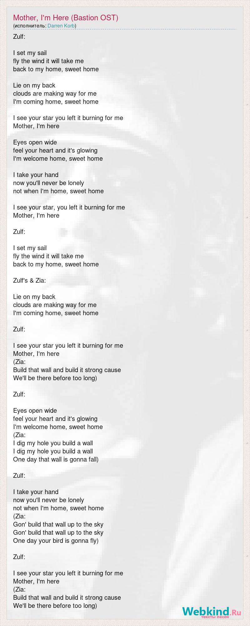 Zulf: I set my sail fly the wind it will take me back to my home, sweet home Lie on my back clouds are making way for me I'm coming home, sweet home I see your star you left it burning for me Mother, I'm here Eyes open wide feel your heart and it's glowing I'm welcome home, sweet home I take your hand now you'll never be lonely not when I'm home, sweet home I see your star, you left it burning for me Mother, I'm here Zulf: I set my sail fly the wind it will take me back to my home, sweet home Zulf's & Zia: Lie on my back clouds are making way for me I'm coming home, sweet home Zulf: I see your star you left it burning for me Mother, I'm here (Zia: Build that wall and build it strong cause We'll be there before too long) Zulf: Eyes open wide feel your heart and it's glowing I'm welcome home, sweet home (Zia: I dig my hole you build a wall I dig my hole you build a wall One day that wall is gonna fall) Zulf: I take your hand now you'll never be lonely not when I'm home, sweet home (Zia: Gon' build that wall up to the sky Gon' build that wall up to the sky One day your bird is gonna fly) Zulf: I see your star you left it burning for me Mother, I'm here (Zia: Build that wall and build it strong cause We'll be there before too long)