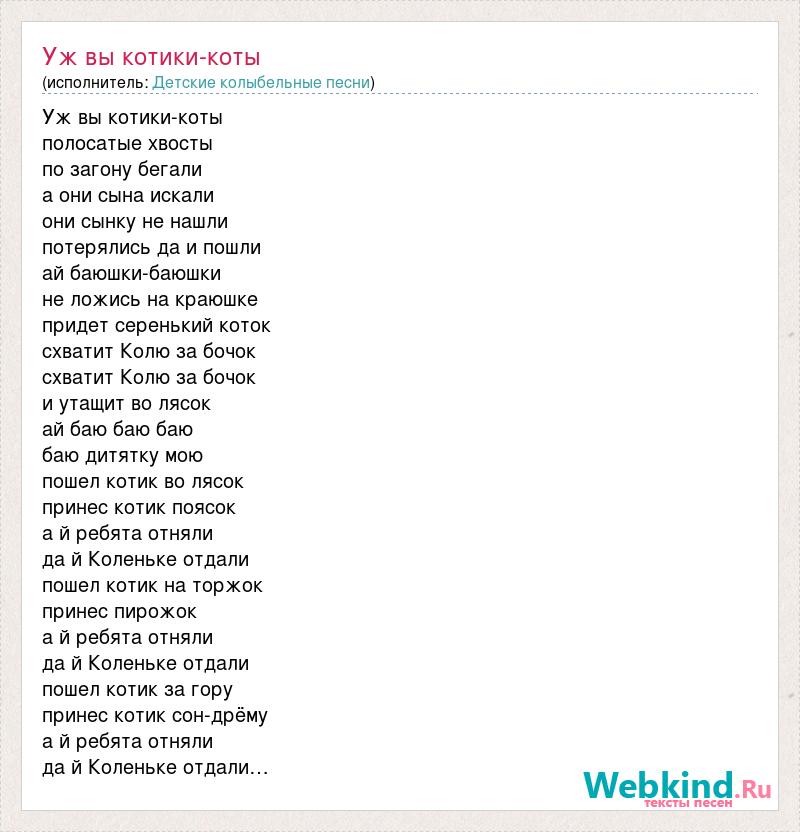 Уж вы котики-коты полосатые хвосты по загону бегали а они сына искали они сынку не нашли потерялись да и пошли ай баюшки-баюшки не ложись на краюшке придет серенький коток схватит Колю за бочок схватит Колю за бочок и утащит во лясок ай баю баю баю баю дитятку мою пошел котик во лясок принес котик поясок а й ребята отняли да й Коленьке отдали пошел котик на торжок принес пирожок а й ребята отняли да й Коленьке отдали пошел котик за гору принес котик сон-дрёму а й ребята отняли да й Коленьке отдали…