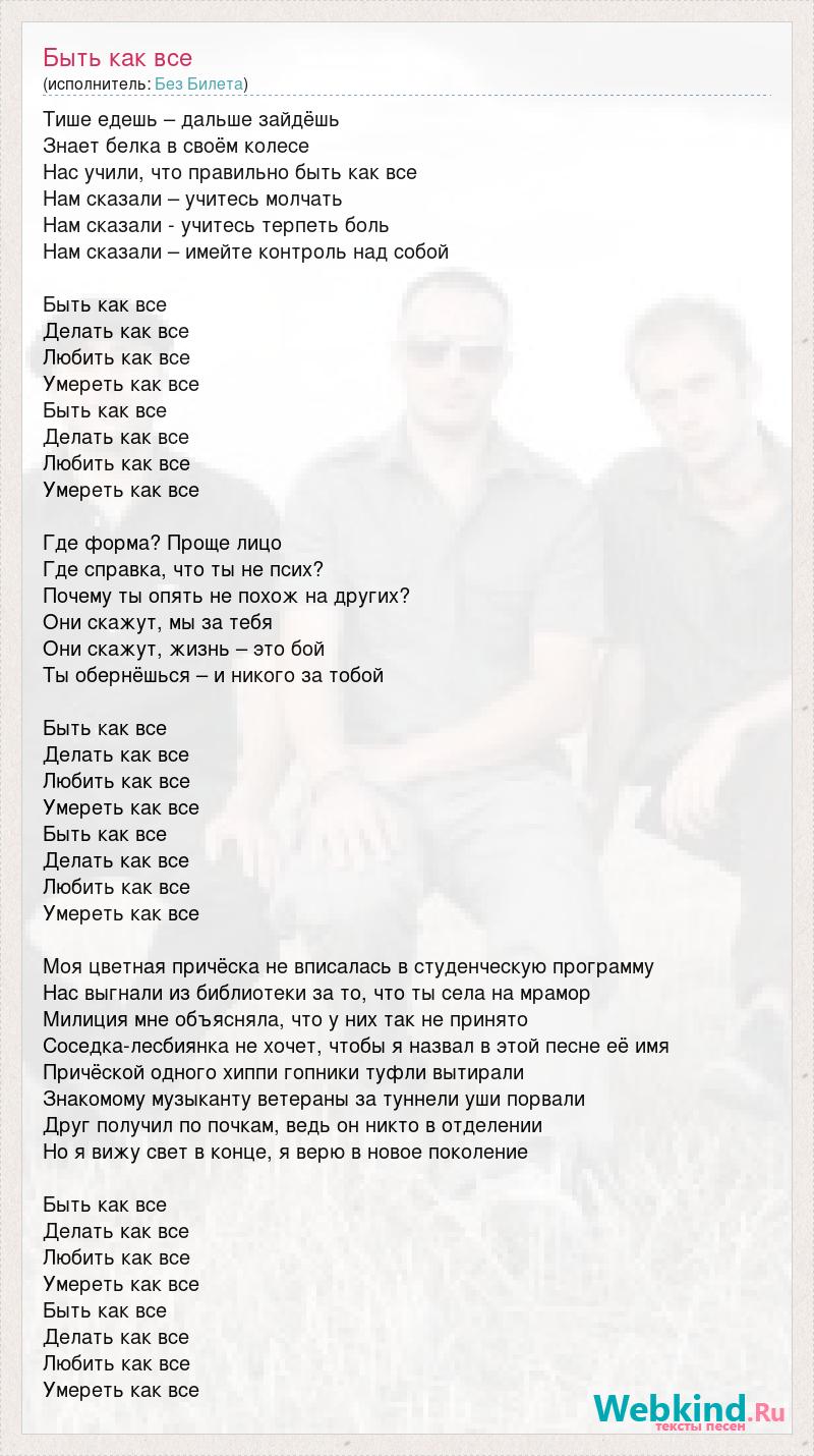 Тише едешь – дальше зайдёшь Знает белка в своём колесе Нас учили, что правильно быть как все Нам сказали – учитесь молчать Нам сказали - учитесь терпеть боль Нам сказали – имейте контроль над собой Быть как все Делать как все Любить как все Умереть как все Быть как все Делать как все Любить как все Умереть как все Где форма? Проще лицо Где справка, что ты не псих? Почему ты опять не похож на других? Они скажут, мы за тебя Они скажут, жизнь – это бой Ты обернёшься – и никого за тобой Быть как все Делать как все Любить как все Умереть как все Быть как все Делать как все Любить как все Умереть как все Моя цветная причёска не вписалась в студенческую программу Нас выгнали из библиотеки за то, что ты села на мрамор Милиция мне объясняла, что у них так не принято Соседка-лесбиянка не хочет, чтобы я назвал в этой песне её имя Причёской одного хиппи гопники туфли вытирали Знакомому музыканту ветераны за туннели уши порвали Друг получил по почкам, ведь он никто в отделении Но я вижу свет в конце, я верю в новое поколение Быть как все Делать как все Любить как все Умереть как все Быть как все Делать как все Любить как все Умереть как все