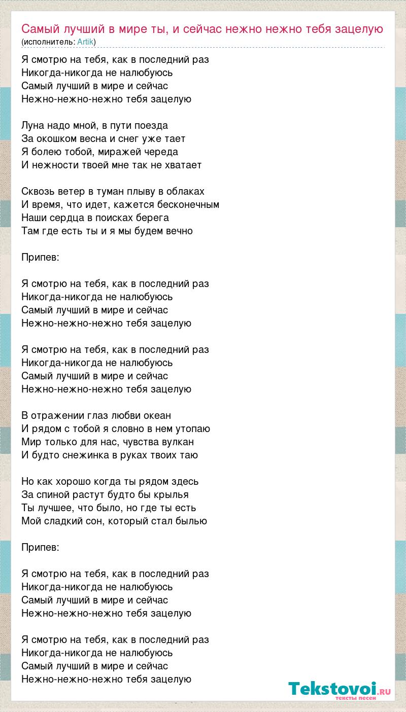 Я смотрю на тебя, как в последний раз Никогда-никогда не налюбуюсь Самый лучший в мире и сейчас Нежно-нежно-нежно тебя зацелую Луна надо мной, в пути поезда За окошком весна и снег уже тает Я болею тобой, миражей череда И нежности твоей мне так не хватает Сквозь ветер в туман плыву в облаках И время, что идет, кажется бесконечным Наши сердца в поисках берега Там где есть ты и я мы будем вечно Припев: Я смотрю на тебя, как в последний раз Никогда-никогда не налюбуюсь Самый лучший в мире и сейчас Нежно-нежно-нежно тебя зацелую Я смотрю на тебя, как в последний раз Никогда-никогда не налюбуюсь Самый лучший в мире и сейчас Нежно-нежно-нежно тебя зацелую В отражении глаз любви океан И рядом с тобой я словно в нем утопаю Мир только для нас, чувства вулкан И будто снежинка в руках твоих таю Но как хорошо когда ты рядом здесь За спиной растут будто бы крылья Ты лучшее, что было, но где ты есть Мой сладкий сон, который стал былью Припев: Я смотрю на тебя, как в последний раз Никогда-никогда не налюбуюсь Самый лучший в мире и сейчас Нежно-нежно-нежно тебя зацелую Я смотрю на тебя, как в последний раз Никогда-никогда не налюбуюсь Самый лучший в мире и сейчас Нежно-нежно-нежно тебя зацелую
