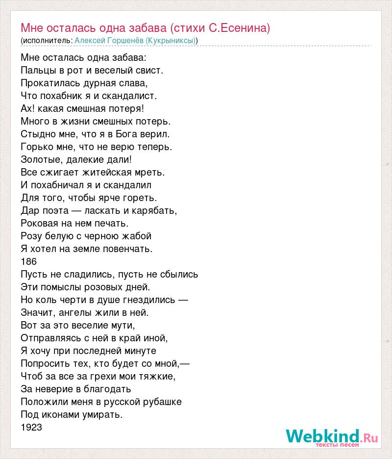 А как ты думаешь, о чем песня "Мне осталась одна забава (стихи С.Есенина)" ?