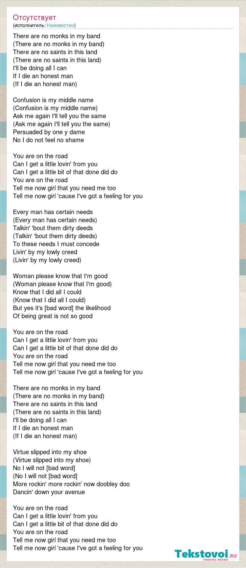 There are no monks in my band (There are no monks in my band) There are no saints in this land (There are no saints in this land) I'll be doing all I can If I die an honest man (If I die an honest man) Confusion is my middle name (Confusion is my middle name) Ask me again I'll tell you the same (Ask me again I'll tell you the same) Persuaded by one y dame No I do not feel no shame You are on the road Can I get a little lovin' from you Can I get a little bit of that done did do You are on the road Tell me now girl that you need me too Tell me now girl 'cause I've got a feeling for you Every man has certain needs (Every man has certain needs) Talkin' 'bout them dirty deeds (Talkin' 'bout them dirty deeds) To these needs I must concede Livin' by my lowly creed (Livin' by my lowly creed) Woman please know that I'm good (Woman please know that I'm good) Know that I did all I could (Know that I did all I could) But yes it's true the likelihood Of being great is not so good You are on the road Can I get a little lovin' from you Can I get a little bit of that done did do You are on the road Tell me now girl that you need me too Tell me now girl 'cause I've got a feeling for you There are no monks in my band (There are no monks in my band) There are no saints in this land (There are no saints in this land) I'll be doing all I can If I die an honest man (If I die an honest man) Virtue slipped into my shoe (Virtue slipped into my shoe) No I will not misconstrue (No I will not misconstrue) More rockin' more rockin' now doobley doo Dancin' down your avenue You are on the road Can I get a little lovin' from you Can I get a little bit of that done did do You are on the road Tell me now girl that you need me too Tell me now girl 'cause I've got a feeling for you