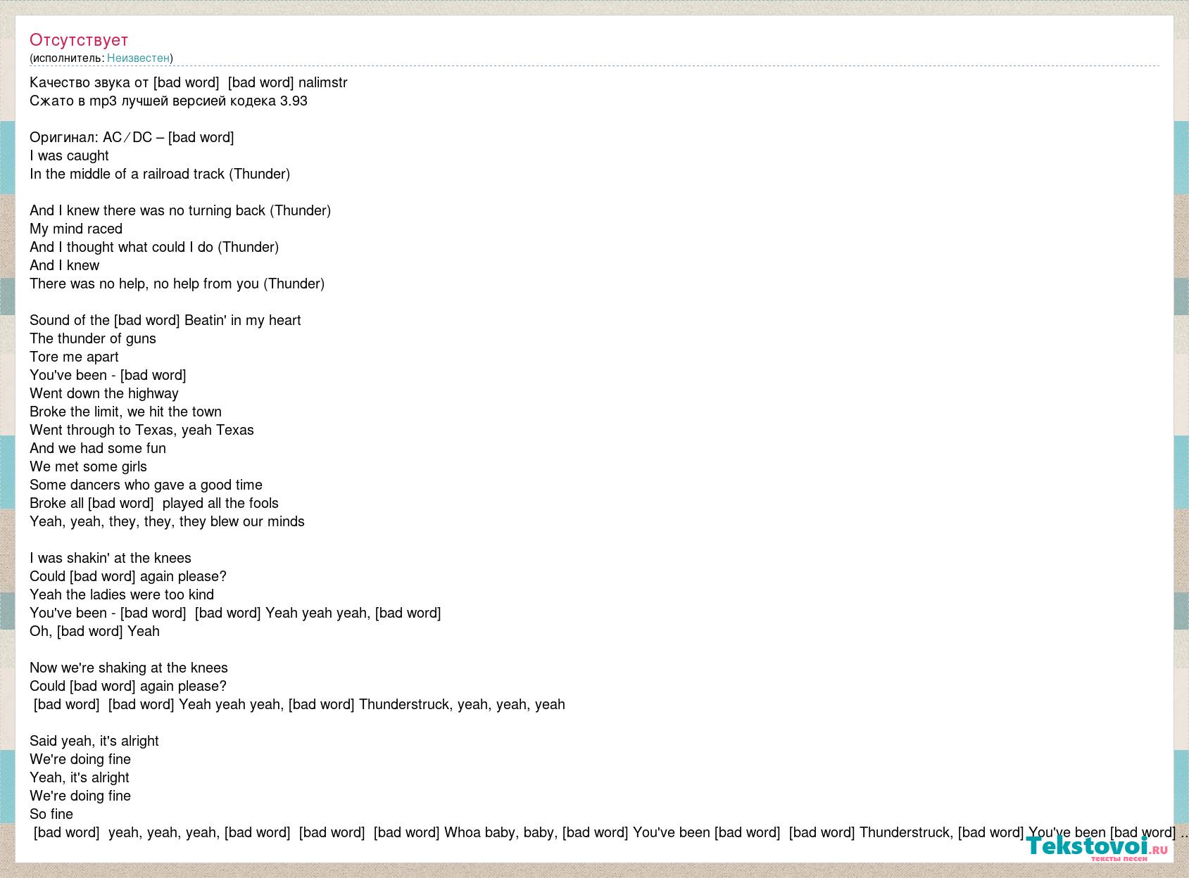 Качество звука от [bad word] [bad word] nalimstr Сжато в mp3 лучшей версией кодека 3.93 Оригинал: AC ⁄ DC – Thunderstruck I was caught In the middle of a railroad track (Thunder) And I knew there was no turning back (Thunder) My mind raced And I thought what could I do (Thunder) And I knew There was no help, no help from you (Thunder) Sound of the drums Beatin' in my heart The thunder of guns Tore me apart You've been - thunderstruck Went down the highway Broke the limit, we hit the town Went through to Texas, yeah Texas And we had some fun We met some girls Some dancers who gave a good time Broke all the rules, played all the fools Yeah, yeah, they, they, they blew our minds I was shakin' at the knees Could I come again please? Yeah the ladies were too kind You've been - thunderstruck, thunderstruck Yeah yeah yeah, thunderstruck Oh, thunderstruck Yeah Now we're shaking at the knees Could I come again please? Thunderstruck, thunderstruck Yeah yeah yeah, thunderstruck Thunderstruck, yeah, yeah, yeah Said yeah, it's alright We're doing fine Yeah, it's alright We're doing fine So fine Thunderstruck, yeah, yeah, yeah, Tunderstruck, thunderstruck, thunderstruck Whoa baby, baby, thunderstruck You've been thunderstruck, thunderstruck Thunderstruck, thunderstruck You've been thunderstruck...
