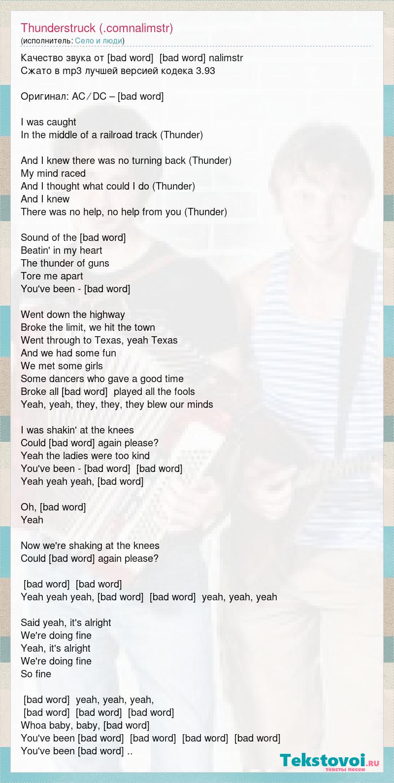 Качество звука от [bad word] [bad word] nalimstr Сжато в mp3 лучшей версией кодека 3.93 Оригинал: AC ⁄ DC – [bad word] I was caught In the middle of a railroad track (Thunder) And I knew there was no turning back (Thunder) My mind raced And I thought what could I do (Thunder) And I knew There was no help, no help from you (Thunder) Sound of the [bad word] Beatin' in my heart The thunder of guns Tore me apart You've been - [bad word] Went down the highway Broke the limit, we hit the town Went through to Texas, yeah Texas And we had some fun We met some girls Some dancers who gave a good time Broke all [bad word] played all the fools Yeah, yeah, they, they, they blew our minds I was shakin' at the knees Could [bad word] again please? Yeah the ladies were too kind You've been - [bad word] [bad word] Yeah yeah yeah, [bad word] Oh, [bad word] Yeah Now we're shaking at the knees Could [bad word] again please? [bad word] [bad word] Yeah yeah yeah, [bad word] [bad word] yeah, yeah, yeah Said yeah, it's alright We're doing fine Yeah, it's alright We're doing fine So fine [bad word] yeah, yeah, yeah, [bad word] [bad word] [bad word] Whoa baby, baby, [bad word] You've been [bad word] [bad word] [bad word] [bad word] You've been [bad word] ..