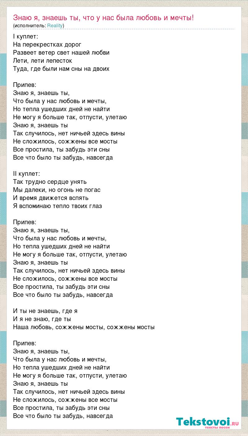 I куплет: На перекрестках дорог Развеет ветер свет нашей любви Лети, лети лепесток Туда, где были нам сны на двоих Припев: Знаю я, знаешь ты, Что была у нас любовь и мечты, Но тепла ушедших дней не найти Не могу я больше так, отпусти, улетаю Знаю я, знаешь ты Так случилось, нет ничьей здесь вины Не сложилось, сожжены все мосты Все простила, ты забудь эти сны Все что было ты забудь, навсегда II куплет: Так трудно сердце унять Мы далеки, но огонь не погас И время движется вспять Я вспоминаю тепло твоих глаз Припев: Знаю я, знаешь ты, Что была у нас любовь и мечты, Но тепла ушедших дней не найти Не могу я больше так, отпусти, улетаю Знаю я, знаешь ты Так случилось, нет ничьей здесь вины Не сложилось, сожжены все мосты Все простила, ты забудь эти сны Все что было ты забудь, навсегда И ты не знаешь, где я И я не знаю, где ты Наша любовь, сожжены мосты, сожжены мосты Припев: Знаю я, знаешь ты, Что была у нас любовь и мечты, Но тепла ушедших дней не найти Не могу я больше так, отпусти, улетаю Знаю я, знаешь ты Так случилось, нет ничьей здесь вины Не сложилось, сожжены все мосты Все простила, ты забудь эти сны Все что было ты забудь, навсегда