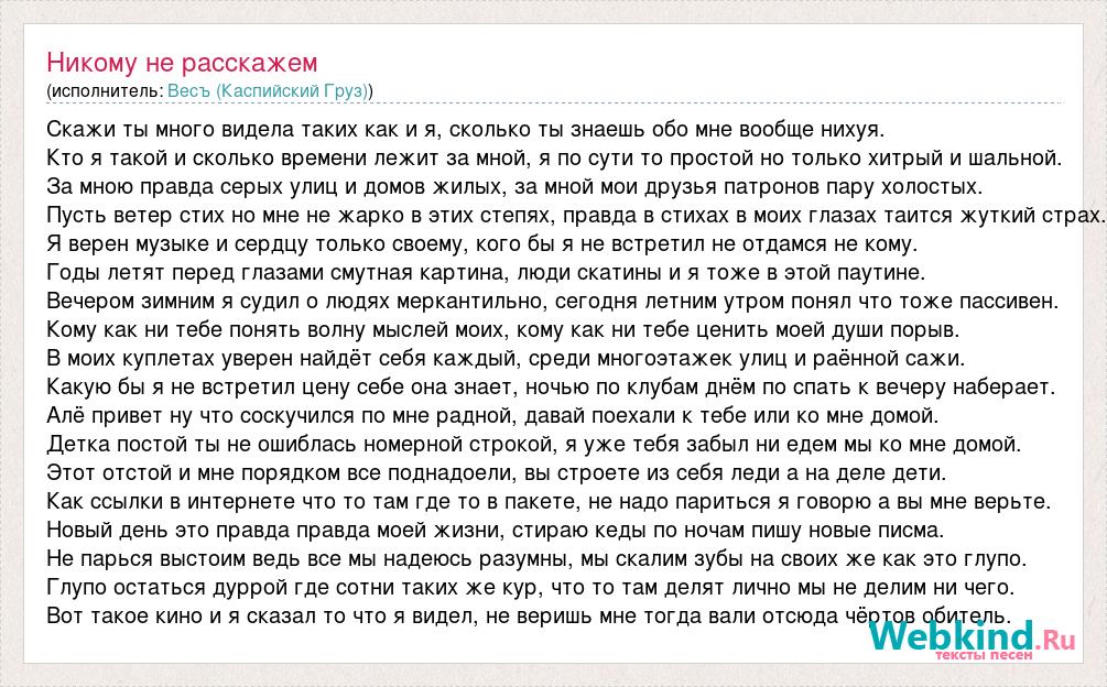 Скажи ты много видела таких как и я, сколько ты знаешь обо мне вообще нихуя. Кто я такой и сколько времени лежит за мной, я по сути то простой но только хитрый и шальной. За мною правда серых улиц и домов жилых, за мной мои друзья патронов пару холостых. Пусть ветер стих но мне не жарко в этих степях, правда в стихах в моих глазах таится жуткий страх. Я верен музыке и сердцу только своему, кого бы я не встретил не отдамся не кому. Годы летят перед глазами смутная картина, люди скатины и я тоже в этой паутине. Вечером зимним я судил о людях меркантильно, сегодня летним утром понял что тоже пассивен. Кому как ни тебе понять волну мыслей моих, кому как ни тебе ценить моей души порыв. В моих куплетах уверен найдёт себя каждый, среди многоэтажек улиц и раённой сажи. Какую бы я не встретил цену себе она знает, ночью по клубам днём по спать к вечеру наберает. Алё привет ну что соскучился по мне радной, давай поехали к тебе или ко мне домой. Детка постой ты не ошиблась номерной строкой, я уже тебя забыл ни едем мы ко мне домой. Этот отстой и мне порядком все поднадоели, вы строете из себя леди а на деле дети. Как ссылки в интернете что то там где то в пакете, не надо париться я говорю а вы мне верьте. Новый день это правда правда моей жизни, стираю кеды по ночам пишу новые писма. Не парься выстоим ведь все мы надеюсь разумны, мы скалим зубы на своих же как это глупо. Глупо остаться дуррой где сотни таких же кур, что то там делят лично мы не делим ни чего. Вот такое кино и я сказал то что я видел, не веришь мне тогда вали отсюда чёртов обитель.
