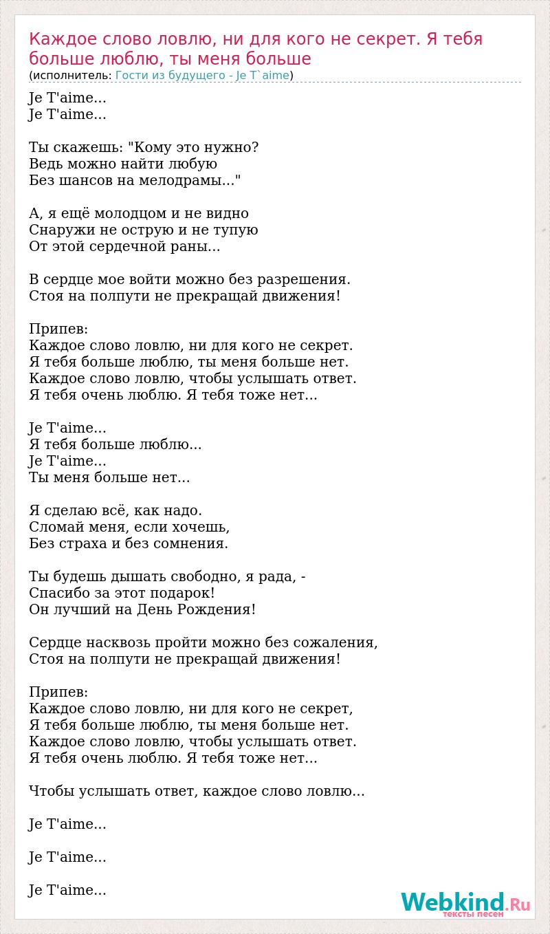 Главная→Исполнители→Гости из будущего - Je T`aime→Каждое слово ловлю, ни для кого не секрет. Я тебя больше люблю, ты меня бол