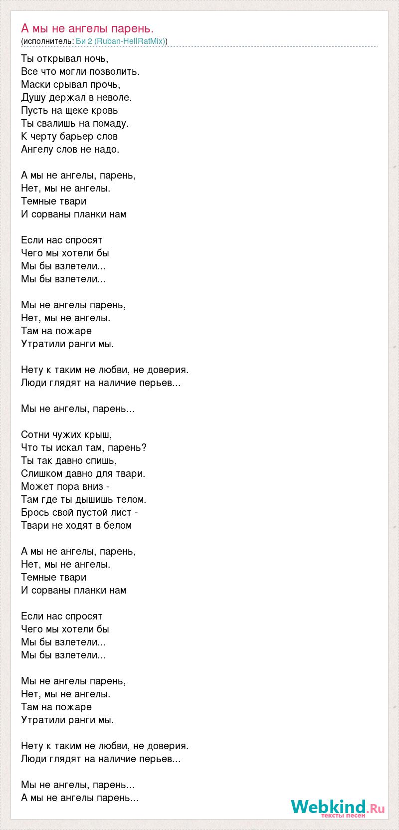 Ты открывал ночь, Все что могли позволить. Маски срывал прочь, Душу держал в неволе. Пусть на щеке кровь Ты свалишь на помаду. К черту барьер слов Ангелу слов не надо. А мы не ангелы, парень, Нет, мы не ангелы. Темные твари И сорваны планки нам Если нас спросят Чего мы хотели бы Мы бы взлетели... Мы бы взлетели... Мы не ангелы парень, Нет, мы не ангелы. Там на пожаре Утратили ранги мы. Нету к таким не любви, не доверия. Люди глядят на наличие перьев... Мы не ангелы, парень... Сотни чужих крыш, Что ты искал там, парень? Ты так давно спишь, Слишком давно для твари. Может пора вниз - Там где ты дышишь телом. Брось свой пустой лист - Твари не ходят в белом А мы не ангелы, парень, Нет, мы не ангелы. Темные твари И сорваны планки нам Если нас спросят Чего мы хотели бы Мы бы взлетели... Мы бы взлетели... Мы не ангелы парень, Нет, мы не ангелы. Там на пожаре Утратили ранги мы. Нету к таким не любви, не доверия. Люди глядят на наличие перьев... Мы не ангелы, парень... А мы не ангелы парень...
