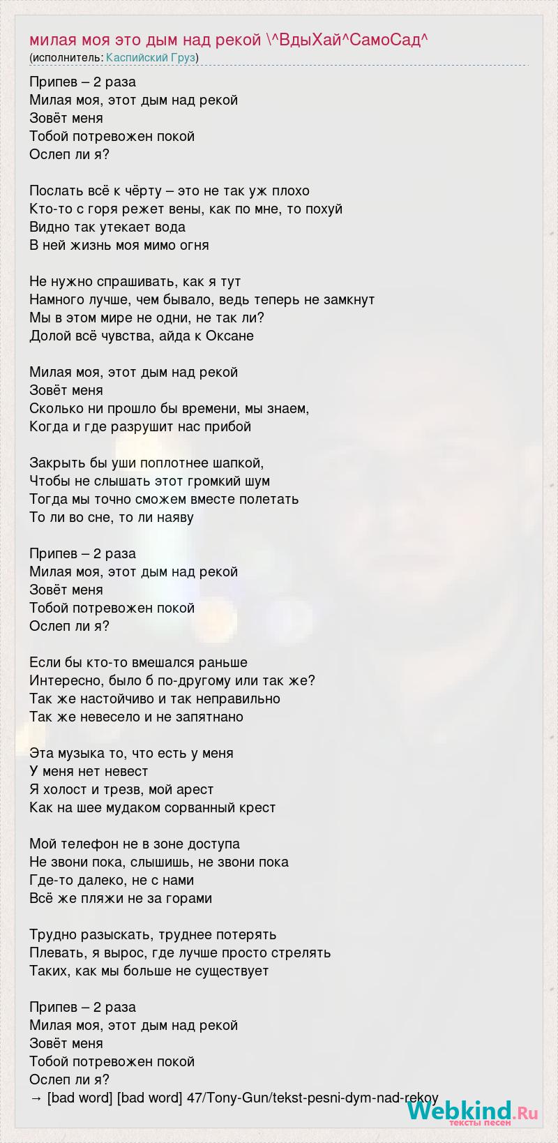 Припев – 2 раза Милая моя, этот дым над рекой Зовёт меня Тобой потревожен покой Ослеп ли я? Послать всё к чёрту – это не так уж плохо Кто-то с горя режет вены, как по мне, то похуй Видно так утекает вода В ней жизнь моя мимо огня Не нужно спрашивать, как я тут Намного лучше, чем бывало, ведь теперь не замкнут Мы в этом мире не одни, не так ли? Долой всё чувства, айда к Оксане Милая моя, этот дым над рекой Зовёт меня Сколько ни прошло бы времени, мы знаем, Когда и где разрушит нас прибой Закрыть бы уши поплотнее шапкой, Чтобы не слышать этот громкий шум Тогда мы точно сможем вместе полетать То ли во сне, то ли наяву Припев – 2 раза Милая моя, этот дым над рекой Зовёт меня Тобой потревожен покой Ослеп ли я? Если бы кто-то вмешался раньше Интересно, было б по-другому или так же? Так же настойчиво и так неправильно Так же невесело и не запятнано Эта музыка то, что есть у меня У меня нет невест Я холост и трезв, мой арест Как на шее мудаком сорванный крест Мой телефон не в зоне доступа Не звони пока, слышишь, не звони пока Где-то далеко, не с нами Всё же пляжи не за горами Трудно разыскать, труднее потерять Плевать, я вырос, где лучше просто стрелять Таких, как мы больше не существует Припев – 2 раза Милая моя, этот дым над рекой Зовёт меня Тобой потревожен покой Ослеп ли я? → [bad word] [bad word] 47/Tony-Gun/tekst-pesni-dym-nad-rekoy