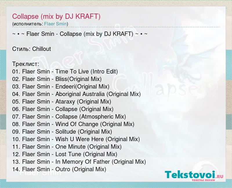 ~ • ~ Flaer Smin - Collapse (mix by DJ KRAFT) ~ • ~ Стиль: Chillout Треклист: 01. Flaer Smin - Time To Live (Intro Edit) 02. Flaer Smin - Bliss(Original Mix) 03. Flaer Smin - Endeeri(Original Mix) 04. Flaer Smin - Aboriginal Australia (Original Mix) 05. Flaer Smin - Ataraxy (Original Mix) 06. Flaer Smin - Collapse (Original Mix) 07. Flaer Smin - Collapse (Atmospheric Mix) 08. Flaer Smin - Wind Of Change (Original Mix) 09. Flaer Smin - Solitude (Original Mix) 10. Flaer Smin - Wish U Were Here (Original Mix) 11. Flaer Smin - One Minute (Original Mix) 12. Flaer Smin - Lost Tune (Original Mix) 13. Flaer Smin - In Memory Of Father (Original Mix) 14. Flaer Smin - Outro (Original Mix)