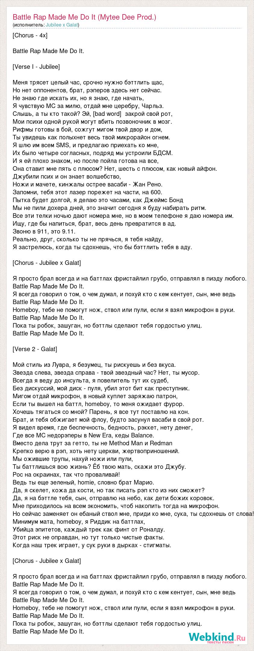 [Chorus - 4x] Battle Rap Made Me Do It. [Verse I - Jubilee] Меня трясет целый час, срочно нужно бэттлить щас, Но нет оппонентов, брат, рэперов здесь нет сейчас. Не знаю где искать их, но я знаю, где начать, Я чувствую MC за милю, отдай мне церебру, Чарльз. Слышь, а ты кто такой? Эй, [bad word] закрой свой рот, Мои психи одной рукой могут вбить позвоночник в мозг. Рифмы готовы в бой, сожгут мигом твой двор и дом, Ты увидешь как полыхнет весь твой микрорайон огнем. Я шлю им всем SMS, и предлагаю приехать ко мне, Их было четыре согласных, подряд мы устроили БДСМ. И я ей плохо знаком, но после пойла готова на все, Она ставит мне пять с плюсом? Нет, шесть с плюсом, как новый айфон. Джубили псих и он знает волшебство, Ножи и мачете, кинжалы острее васаби - Жан Рено. Запомни, тебя этот лазер порежет на части, на 600. Пытка будет долгой, я делаю это часами, как Джеймс Бонд Мы не пили дохера дней, это значит сегодня я буду набирать ритм. Все эти телки ночью дают номера мне, но в моем телефоне я даю номера им. Ищу, где бы напиться, брат, весь день превратится в ад. Звоню в 911, это 9.11. Реально, друг, сколько ты не прячься, я тебя найду, Я застрелюсь, когда ты сдохнешь, что бы бэттлить тебя в аду. [Chorus - Jubilee x Galat] Я просто брал всегда и на баттлах фристайлил грубо, отправлял в пизду любого. Battle Rap Made Me Do It. Я всегда говорил о том, о чем думал, и похуй кто с кем кентует, сын, мне ведь Battle Rap Made Me Do It. Homeboy, тебе не помогут нож, ствол или пули, если я взял микрофон в руки. Battle Rap Made Me Do It. Пока ты робок, зашуган, но бэттлы сделают тебя гордостью улиц. Battle Rap Made Me Do It. [Verse 2 - Galat] Мой стиль из Лувра, я безумец, ты рискуешь и без вкуса. Звезда слева, звезда справа - твой звездный час? Нет, ты мусор. Всегда я веду до инсульта, я повелитель тут их судеб, Без дискуссий, мой диск - пуля, убил этот бит как преступник. Мигом отдай микрофон, в новый куплет заряжаю патрон, Если ты вышел на баттл, homeboy, то меня ожидает фурор. Хочешь тягаться со мной? Парень, я все тут поставлю на кон. Брат, и тебя обжигает мой флоу, будто засунул васаби в свой рот. Я видел время, где беспечность, бедность, рэккет, нету денег, Где все MC недорэперы в New Era, кеды Balance. Вместо дела трут за гетто, ты не Method Man и Redman Крепко верю в рэп, хоть нету церкви, жертвоприношений. Мы ожившие трупы, нахуй ножи или пули, Ты баттлишься всю жизнь? Ёб твою мать, скажи это Джубу. Рос на окраинах, так что проваливай! Ведь ты еще зеленый, homie, словно брат Марио. Да, я скелет, кожа да кости, но так писать рэп кто из них сможет? Да, я на бэттле тебя, сын, отправлю на небо, как дети божих коровок. Мне приходилось на всем экономить, чтоб накопить тогда на микрофон. Но сейчас заменяет он ебаный ствол мне, приди ко мне, сука, ты сдохнешь от слова! Минимум мата, homeboy, я Риддик на баттлах, Убийца эпитетов, каждый трек как финт от Роналду. Этот риск не оправдан, но тут только чистые факты. Когда наш трек играет, у сук руки в дырках - стигматы. [Chorus - Jubilee x Galat] Я просто брал всегда и на баттлах фристайлил грубо, отправлял в пизду любого. Battle Rap Made Me Do It. Я всегда говорил о том, о чем думал, и похуй кто с кем кентует, сын, мне ведь Battle Rap Made Me Do It. Homeboy, тебе не помогут нож, ствол или пули, если я взял микрофон в руки. Battle Rap Made Me Do It. Пока ты робок, зашуган, но бэттлы сделают тебя гордостью улиц. Battle Rap Made Me Do It.