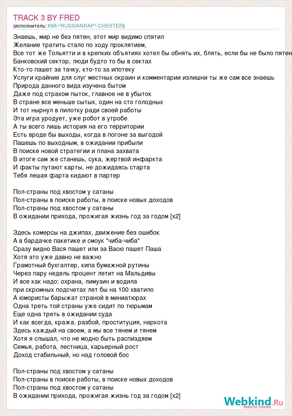 Знаешь, мир не без пятен, этот мир видимо спятил Желание тратить стало по ходу проклятием, Все тот же Тольятти и в крепких объятиях хотел бы обнять их, блять, если бы не было пятен Банковский сектор, люди будто то бы в сектах Кто-то пашет за тачку, кто-то за ипотеку Услуги крайние для слуг местных окраин и комментарии излишни ты же сам все знаешь Природа данного вида изучена бытом Даже под страхом пыток, главное не в убыток В стране все меньше сытых, один на сто голодных И тот нырнул в пилотку ради своей работы Эта игра уродует, уже робот в утробе А ты всего лишь история на его территории Есть вроде бы выходы, когда в погоне за выгодой Пашешь по выходным, в ожидании прибыли В поиске новой стратегии и плана захвата В итоге сам же станешь, сука, жертвой инфаркта И факты путают карты, не дожидаясь старта Тебя лешая фарта кидают в партер Пол-страны под хвостом у сатаны Пол-страны в поиске работы, в поиске новых доходов Пол-страны под хвостом у сатаны В ожидании прихода, прожигая жизнь год за годом [x2] Здесь комерсы на джипах, движение без ошибок А в бардачке пакетике и смоук "чиба-чиба" Сразу видно Вася пашет или за Васю пашет Паша Хотя это уже давно не важно Грамотный бухгалтер, кипа бумажной рутины Через пару недель процент летит на Мальдивы И все как надо: охрана, лимузин и водила при скромных подсчетах лет бы на 100 хватило А юмористы барыжат страной в миниатюрах Одна треть той страны уже сидит по тюрьмам Еще одна треть в ожидании суда И как всегда, кража. разбой, проституция, наркота Здесь каждый на своем, а мы все тянем и тянем Хотя я слышал, что не модно быть распиздяем Семья, работа, лестница, карьерный рост Доход стабильный, но над головой бос Пол-страны под хвостом у сатаны Пол-страны в поиске работы, в поиске новых доходов Пол-страны под хвостом у сатаны В ожидании прихода, прожигая жизнь год за годом [x2]