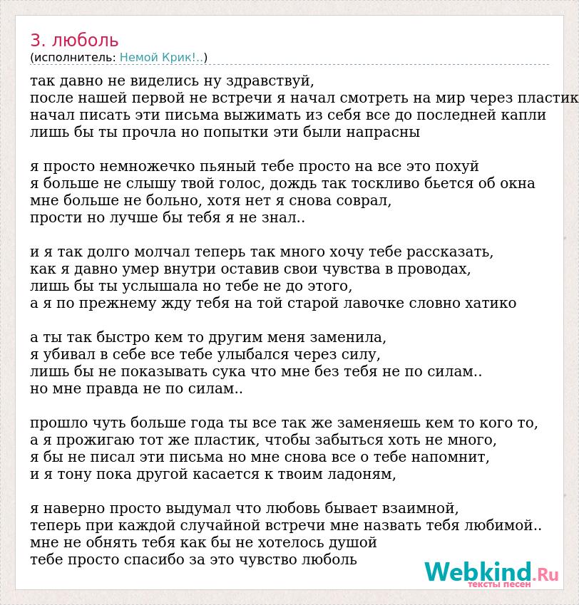 так давно не виделись ну здравствуй, после нашей первой не встречи я начал смотреть на мир через пластик начал писать эти письма выжимать из себя все до последней капли лишь бы ты прочла но попытки эти были напрасны я просто немножечко пьяный тебе просто на все это похуй я больше не слышу твой голос, дождь так тоскливо бьется об окна мне больше не больно, хотя нет я снова соврал, прости но лучше бы тебя я не знал.. и я так долго молчал теперь так много хочу тебе рассказать, как я давно умер внутри оставив свои чувства в проводах, лишь бы ты услышала но тебе не до этого, а я по прежнему жду тебя на той старой лавочке словно хатико а ты так быстро кем то другим меня заменила, я убивал в себе все тебе улыбался через силу, лишь бы не показывать сука что мне без тебя не по силам.. но мне правда не по силам.. прошло чуть больше года ты все так же заменяешь кем то кого то, а я прожигаю тот же пластик, чтобы забыться хоть не много, я бы не писал эти письма но мне снова все о тебе напомнит, и я тону пока другой касается к твоим ладоням, я наверно просто выдумал что любовь бывает взаимной, теперь при каждой случайной встречи мне назвать тебя любимой.. мне не обнять тебя как бы не хотелось душой тебе просто спасибо за это чувство люболь