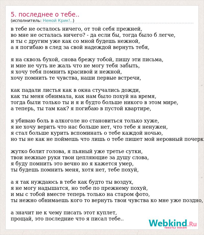 в тебе не осталось ничего, от той себя прежней, во мне не осталась ничего? - да если бы, тогда было б легче, и ты с другим уже как со мной будешь нежной, а я погибаю в след за свой надеждой вернуть тебя, я на сквозь бухой, снова брежу тобой, пишу эти письма, и мне не чуть не жаль что не могу тебя забыть, я хочу тебя помнить красивой и нежной, хочу помнить те чувства, наши первые встречи, как падали листья как в окна стучались дожди, как ты меня обнимала, как нам было похуй на время, тогда были только ты и я и будто больше никого в этом мире, а теперь, ты там как? я погибаю в пустой квартире, я убиваю боль в алкоголе но становиться только хуже, я не хочу верить что нас больше нет, что тебе я ненужен, я стал больше курить вспоминать о тебе каждой ночью, но ты не как не поймешь что лишь о тебе пишет мой неровный почерк жутко болит голова, я пьяный уже третье сутки, твои нежные руки твои цепляющие за душу слова, я буду помнить это вечно но я кажется умер, ты будешь помнить меня, хотя нет, тебе похуй, а я так нуждаюсь в тебе как будто ты воздух, я не могу надышатся, но тебе по прежнему похуй, и мы с тобой вместе теперь только на старом фото, ты нежно обнимаешь кого то вернуть твои чувства ко мне уже поздно, а значит не к чему писать этот куплет, прощай, это последние что я писал тебе..