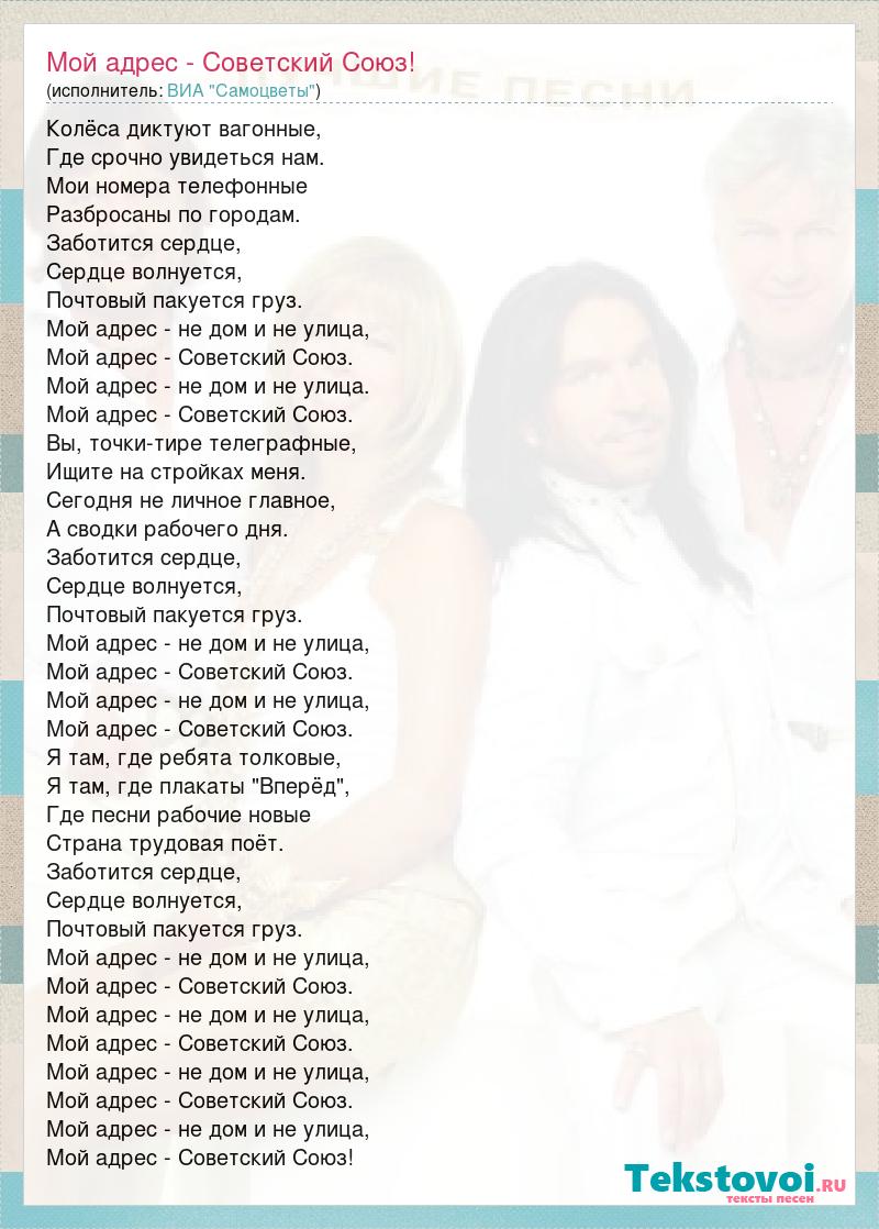 Колёса диктуют вагонные, Где срочно увидеться нам. Мои номера телефонные Разбросаны по городам. Заботится сердце, Сердце волнуется, Почтовый пакуется груз. Мой адрес - не дом и не улица, Мой адрес - Советский Союз. Мой адрес - не дом и не улица. Мой адрес - Советский Союз. Вы, точки-тире телеграфные, Ищите на стройках меня. Сегодня не личное главное, А сводки рабочего дня. Заботится сердце, Сердце волнуется, Почтовый пакуется груз. Мой адрес - не дом и не улица, Мой адрес - Советский Союз. Мой адрес - не дом и не улица, Мой адрес - Советский Союз. Я там, где ребята толковые, Я там, где плакаты "Вперёд", Где песни рабочие новые Страна трудовая поёт. Заботится сердце, Сердце волнуется, Почтовый пакуется груз. Мой адрес - не дом и не улица, Мой адрес - Советский Союз. Мой адрес - не дом и не улица, Мой адрес - Советский Союз. Мой адрес - не дом и не улица, Мой адрес - Советский Союз. Мой адрес - не дом и не улица, Мой адрес - Советский Союз!