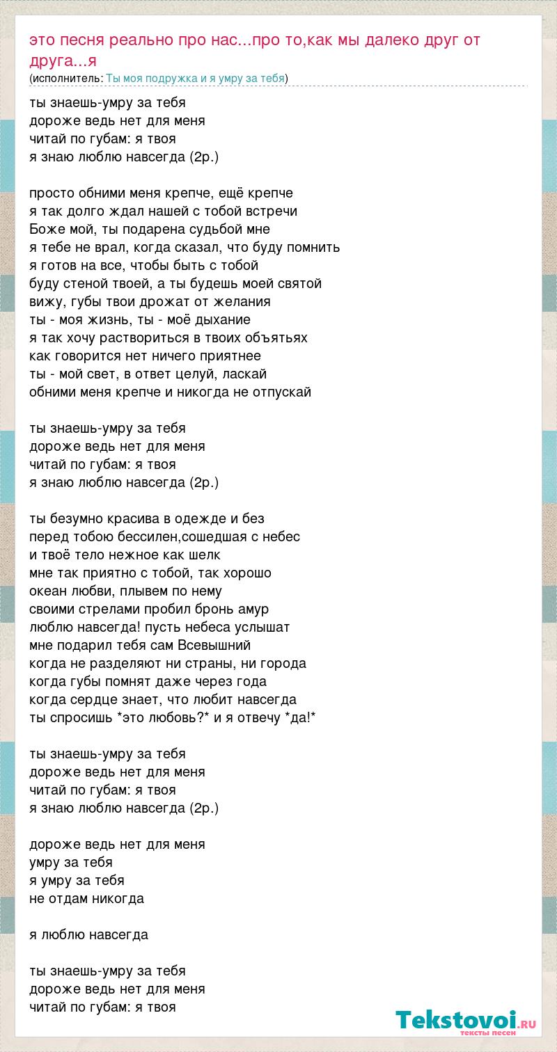 ты знаешь-умру за тебя дороже ведь нет для меня читай по губам: я твоя я знаю люблю навсегда (2р.) просто обними меня крепче, ещё крепче я так долго ждал нашей с тобой встречи Боже мой, ты подарена судьбой мне я тебе не врал, когда сказал, что буду помнить я готов на все, чтобы быть с тобой буду стеной твоей, а ты будешь моей святой вижу, губы твои дрожат от желания ты - моя жизнь, ты - моё дыхание я так хочу раствориться в твоих объятьях как говорится нет ничего приятнее ты - мой свет, в ответ целуй, ласкай обними меня крепче и никогда не отпускай ты знаешь-умру за тебя дороже ведь нет для меня читай по губам: я твоя я знаю люблю навсегда (2р.) ты безумно красива в одежде и без перед тобою бессилен,сошедшая с небес и твоё тело нежное как шелк мне так приятно с тобой, так хорошо океан любви, плывем по нему своими стрелами пробил бронь амур люблю навсегда! пусть небеса услышат мне подарил тебя сам Всевышний когда не разделяют ни страны, ни города когда губы помнят даже через года когда сердце знает, что любит навсегда ты спросишь *это любовь?* и я отвечу *да!* ты знаешь-умру за тебя дороже ведь нет для меня читай по губам: я твоя я знаю люблю навсегда (2р.) дороже ведь нет для меня умру за тебя я умру за тебя не отдам никогда я люблю навсегда ты знаешь-умру за тебя дороже ведь нет для меня читай по губам: я твоя