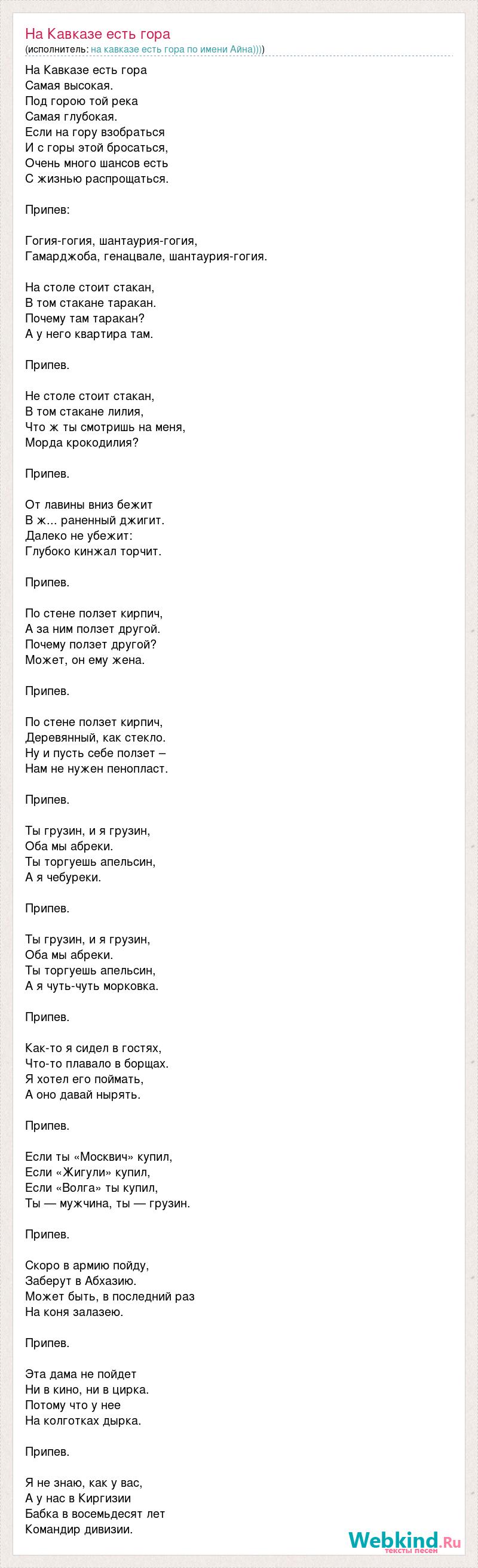На Кавказе есть гора Самая высокая. Под горою той река Самая глубокая. Если на гору взобраться И с горы этой бросаться, Очень много шансов есть С жизнью распрощаться. Припев: Гогия-гогия, шантаурия-гогия, Гамарджоба, генацвале, шантаурия-гогия. На столе стоит стакан, В том стакане таракан. Почему там таракан? А у него квартира там. Припев. Не столе стоит стакан, В том стакане лилия, Что ж ты смотришь на меня, Морда крокодилия? Припев. От лавины вниз бежит В ж... раненный джигит. Далеко не убежит: Глубоко кинжал торчит. Припев. По стене ползет кирпич, А за ним ползет другой. Почему ползет другой? Может, он ему жена. Припев. По стене ползет кирпич, Деревянный, как стекло. Ну и пусть себе ползет – Нам не нужен пенопласт. Припев. Ты грузин, и я грузин, Оба мы абреки. Ты торгуешь апельсин, А я чебуреки. Припев. Ты грузин, и я грузин, Оба мы абреки. Ты торгуешь апельсин, А я чуть-чуть морковка. Припев. Как-то я сидел в гостях, Что-то плавало в борщах. Я хотел его поймать, А оно давай нырять. Припев. Если ты «Москвич» купил, Если «Жигули» купил, Если «Волга» ты купил, Ты — мужчина, ты — грузин. Припев. Скоро в армию пойду, Заберут в Абхазию. Может быть, в последний раз На коня залазею. Припев. Эта дама не пойдет Ни в кино, ни в цирка. Потому что у нее На колготках дырка. Припев. Я не знаю, как у вас, А у нас в Киргизии Бабка в восемьдесят лет Командир дивизии.