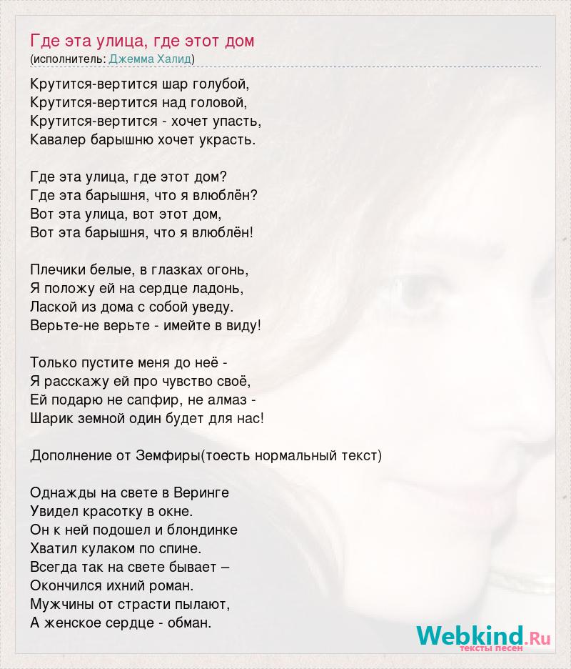 Крутится-вертится шар голубой, Крутится-вертится над головой, Крутится-вертится - хочет упасть, Кавалер барышню хочет украсть. Где эта улица, где этот дом? Где эта барышня, что я влюблён? Вот эта улица, вот этот дом, Вот эта барышня, что я влюблён! Плечики белые, в глазках огонь, Я положу ей на сердце ладонь, Лаской из дома с собой уведу. Верьте-не верьте - имейте в виду! Только пустите меня до неё - Я расскажу ей про чувство своё, Ей подарю не сапфир, не алмаз - Шарик земной один будет для нас! Дополнение от Земфиры(тоесть нормальный текст) Однажды на свете в Веринге Увидел красотку в окне. Он к ней подошел и блондинке Хватил кулаком по спине. Всегда так на свете бывает – Окончился ихний роман. Мужчины от страсти пылают, А женское сердце - обман.