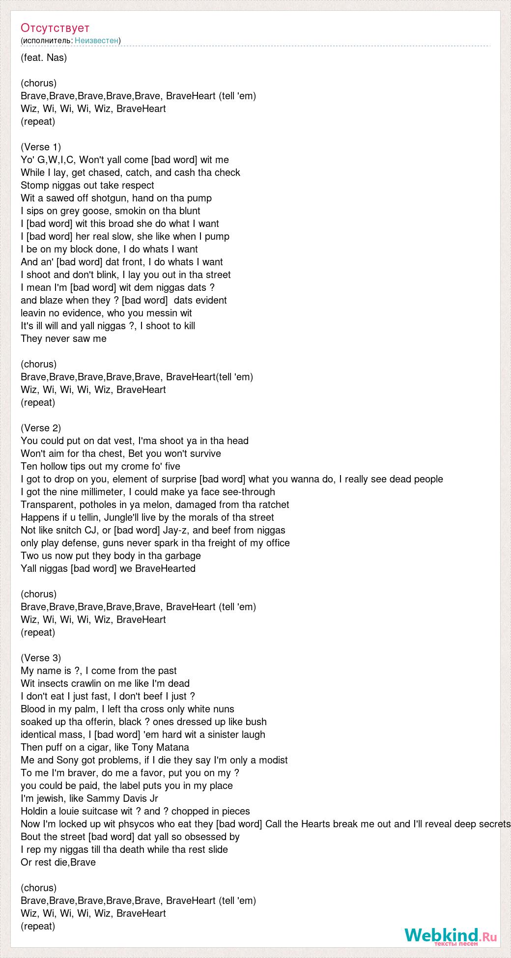 (feat. Nas) (chorus) Brave,Brave,Brave,Brave,Brave, BraveHeart (tell 'em) Wiz, Wi, Wi, Wi, Wiz, BraveHeart (repeat) (Verse 1) Yo' G,W,I,C, Won't yall come [bad word] wit me While I lay, get chased, catch, and cash tha check Stomp niggas out take respect Wit a sawed off shotgun, hand on tha pump I sips on grey goose, smokin on tha blunt I [bad word] wit this broad she do what I want I [bad word] her real slow, she like when I pump I be on my block done, I do whats I want And an' [bad word] dat front, I do whats I want I shoot and don't blink, I lay you out in tha street I mean I'm [bad word] wit dem niggas dats ? and blaze when they ? [bad word] dats evident leavin no evidence, who you messin wit It's ill will and yall niggas ?, I shoot to kill They never saw me (chorus) Brave,Brave,Brave,Brave,Brave, BraveHeart(tell 'em) Wiz, Wi, Wi, Wi, Wiz, BraveHeart (repeat) (Verse 2) You could put on dat vest, I'ma shoot ya in tha head Won't aim for tha chest, Bet you won't survive Ten hollow tips out my crome fo' five I got to drop on you, element of surprise [bad word] what you wanna do, I really see dead people I got the nine millimeter, I could make ya face see-through Transparent, potholes in ya melon, damaged from tha ratchet Happens if u tellin, Jungle'll live by the morals of tha street Not like snitch CJ, or [bad word] Jay-z, and beef from niggas only play defense, guns never spark in tha freight of my office Two us now put they body in tha garbage Yall niggas [bad word] we BraveHearted (chorus) Brave,Brave,Brave,Brave,Brave, BraveHeart (tell 'em) Wiz, Wi, Wi, Wi, Wiz, BraveHeart (repeat) (Verse 3) My name is ?, I come from the past Wit insects crawlin on me like I'm dead I don't eat I just fast, I don't beef I just ? Blood in my palm, I left tha cross only white nuns soaked up tha offerin, black ? ones dressed up like bush identical mass, I [bad word] 'em hard wit a sinister laugh Then puff on a cigar, like Tony Matana Me and Sony got problems, if I die they say I'm only a modist To me I'm braver, do me a favor, put you on my ? you could be paid, the label puts you in my place I'm jewish, like Sammy Davis Jr Holdin a louie suitcase wit ? and ? chopped in pieces Now I'm locked up wit phsycos who eat they [bad word] Call the Hearts break me out and I'll reveal deep secrets Bout the street [bad word] dat yall so obsessed by I rep my niggas till tha death while tha rest slide Or rest die,Brave (chorus) Brave,Brave,Brave,Brave,Brave, BraveHeart (tell 'em) Wiz, Wi, Wi, Wi, Wiz, BraveHeart (repeat)