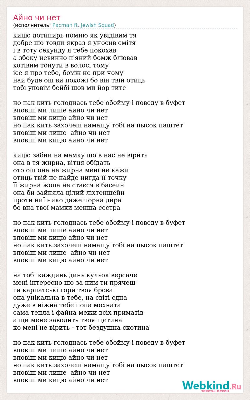 кицю дотипирь помню як увідівим тя добре шо товди якраз я уносив смітя і в тоту секунду я тебе покохав а збоку невинно п'яний бомж блював хотівим тонути в волосі тому ісе я про тебе, бомж не при чому най буде ош ви похожі бо він твій отиць тобі уповім бейбі шов ми йор титс но пак кить голоднась тебе обойму і поведу в буфет вповіш ми лише айно чи нет вповіш ми кицю айно чи нет но пак кить захочеш намащу тобі на пысок паштет вповіш ми лише айно чи нет вповіш ми кицю айно чи нет кицю забий на мамку шо в нас не вірить она в тя жирна, вітця обїдать ото ош она не жирна мені не кажи отиць твій не найде нигда її точку її жирна жопа не стаєся в басейн она би зайняла цілий ліхтеншейн проти ниї нико даже чорна дира бо вна твої мамки менша сестра но пак кить голоднась тебе обойму і поведу в буфет вповіш ми лише айно чи нет вповіш ми кицю айно чи нет но пак кить захочеш намащу тобі на пысок паштет вповіш ми лише айно чи нет вповіш ми кицю айно чи нет на тобі каждинь динь кульок версаче мені інтересно шо за ним ти прячеш ги карпатські гори твоя брова она унікальна в тебе, на світі єдна дуже в ніжна тебе попа мохната сама тепла і файна межи всіх приматів а щи мене заводить твоя щетина ко мені не вірить - тот бездушна скотина но пак кить голоднась тебе обойму і поведу в буфет вповіш ми лише айно чи нет вповіш ми кицю айно чи нет но пак кить захочеш намащу тобі на пысок паштет вповіш ми лише айно чи нет вповіш ми кицю айно чи нет