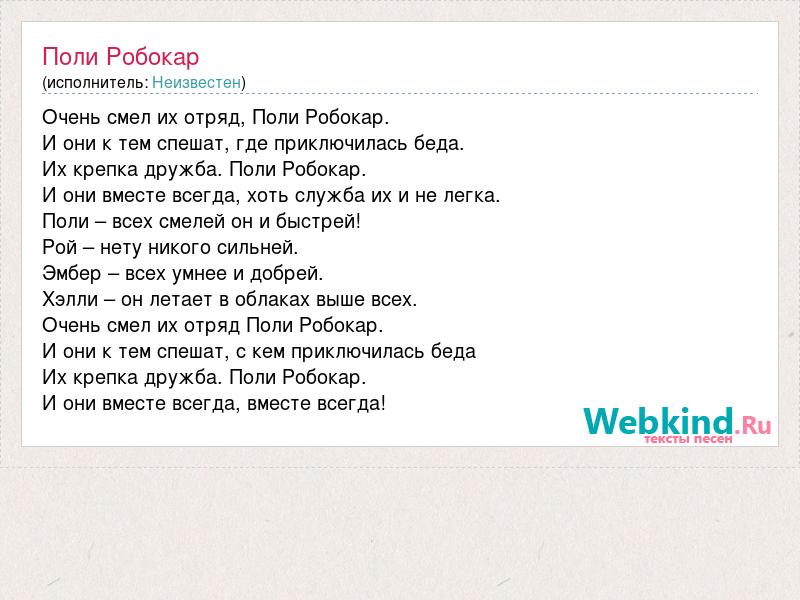 Очень смел их отряд, Поли Робокар. И они к тем спешат, где приключилась беда. Их крепка дружба. Поли Робокар. И они вместе всегда, хоть служба их и не легка. Поли – всех смелей он и быстрей! Рой – нету никого сильней. Эмбер – всех умнее и добрей. Хэлли – он летает в облаках выше всех. Очень смел их отряд Поли Робокар. И они к тем спешат, с кем приключилась беда Их крепка дружба. Поли Робокар. И они вместе всегда, вместе всегда!