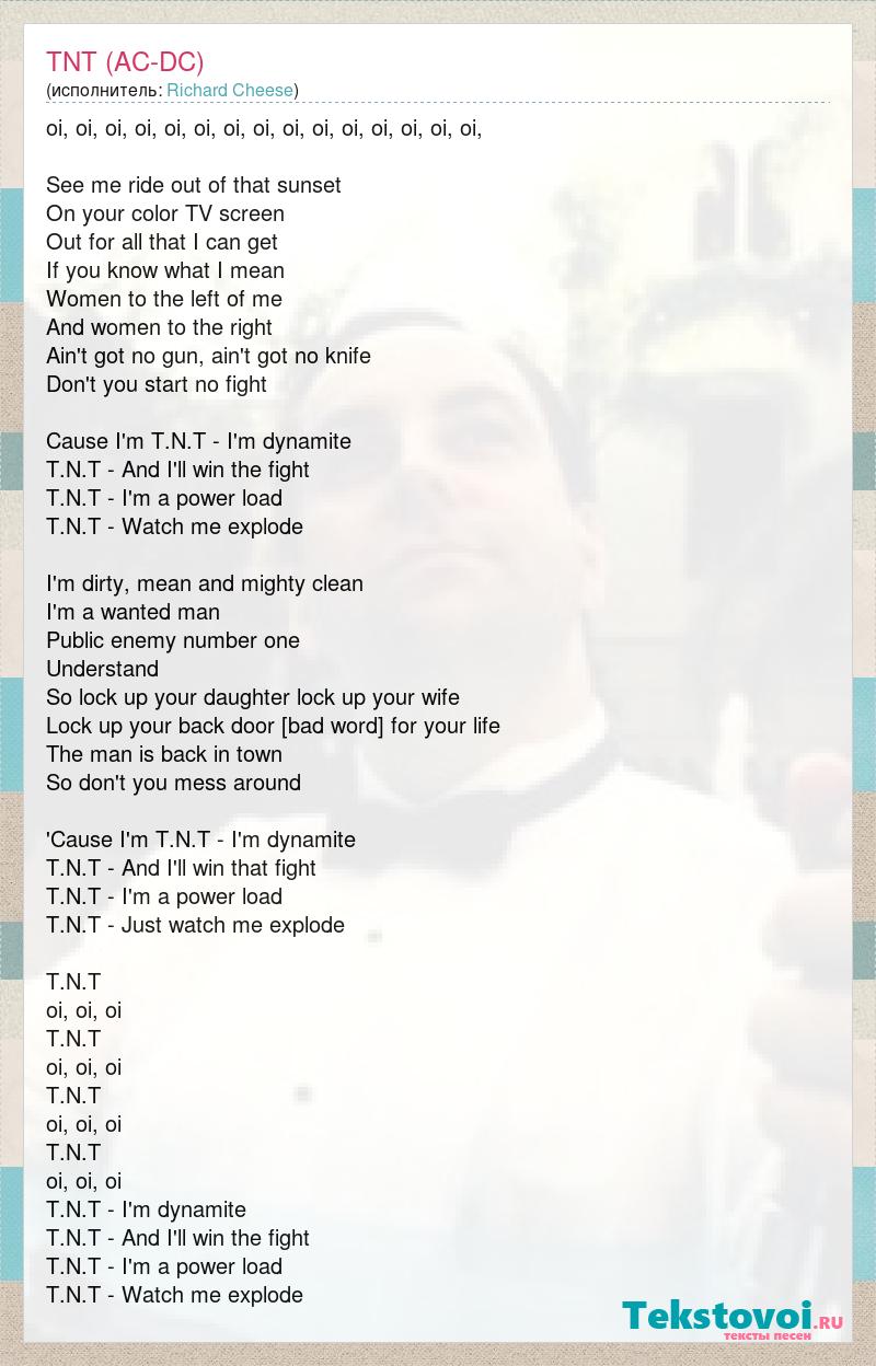 oi, oi, oi, oi, oi, oi, oi, oi, oi, oi, oi, oi, oi, oi, oi, See me ride out of that sunset On your color TV screen Out for all that I can get If you know what I mean Women to the left of me And women to the right Ain't got no gun, ain't got no knife Don't you start no fight Cause I'm T.N.T - I'm dynamite T.N.T - And I'll win the fight T.N.T - I'm a power load T.N.T - Watch me explode I'm dirty, mean and mighty clean I'm a wanted man Public enemy number one Understand So lock up your daughter lock up your wife Lock up your back door and run for your life The man is back in town So don't you mess around 'Cause I'm T.N.T - I'm dynamite T.N.T - And I'll win that fight T.N.T - I'm a power load T.N.T - Just watch me explode T.N.T oi, oi, oi T.N.T oi, oi, oi T.N.T oi, oi, oi T.N.T oi, oi, oi T.N.T - I'm dynamite T.N.T - And I'll win the fight T.N.T - I'm a power load T.N.T - Watch me explode