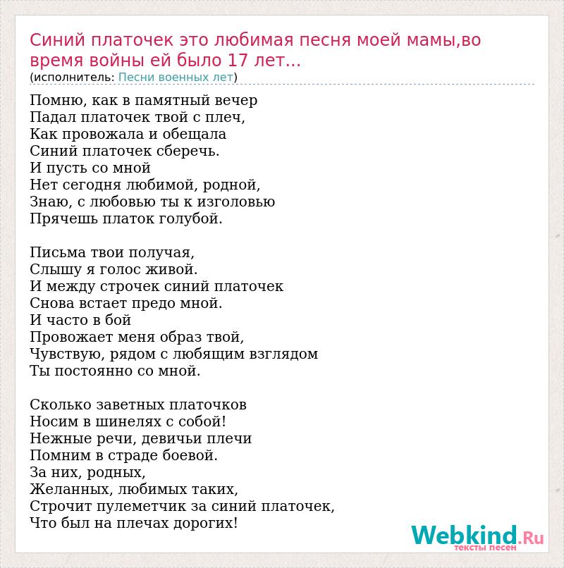 Помню, как в памятный вечер Падал платочек твой с плеч, Как провожала и обещала Синий платочек сберечь. И пусть со мной Нет сегодня любимой, родной, Знаю, с любовью ты к изголовью Прячешь платок голубой. Письма твои получая, Слышу я голос живой. И между строчек синий платочек Снова встает предо мной. И часто в бой Провожает меня образ твой, Чувствую, рядом с любящим взглядом Ты постоянно со мной. Сколько заветных платочков Носим в шинелях с собой! Нежные речи, девичьи плечи Помним в страде боевой. За них, родных, Желанных, любимых таких, Строчит пулеметчик за синий платочек, Что был на плечах дорогих!