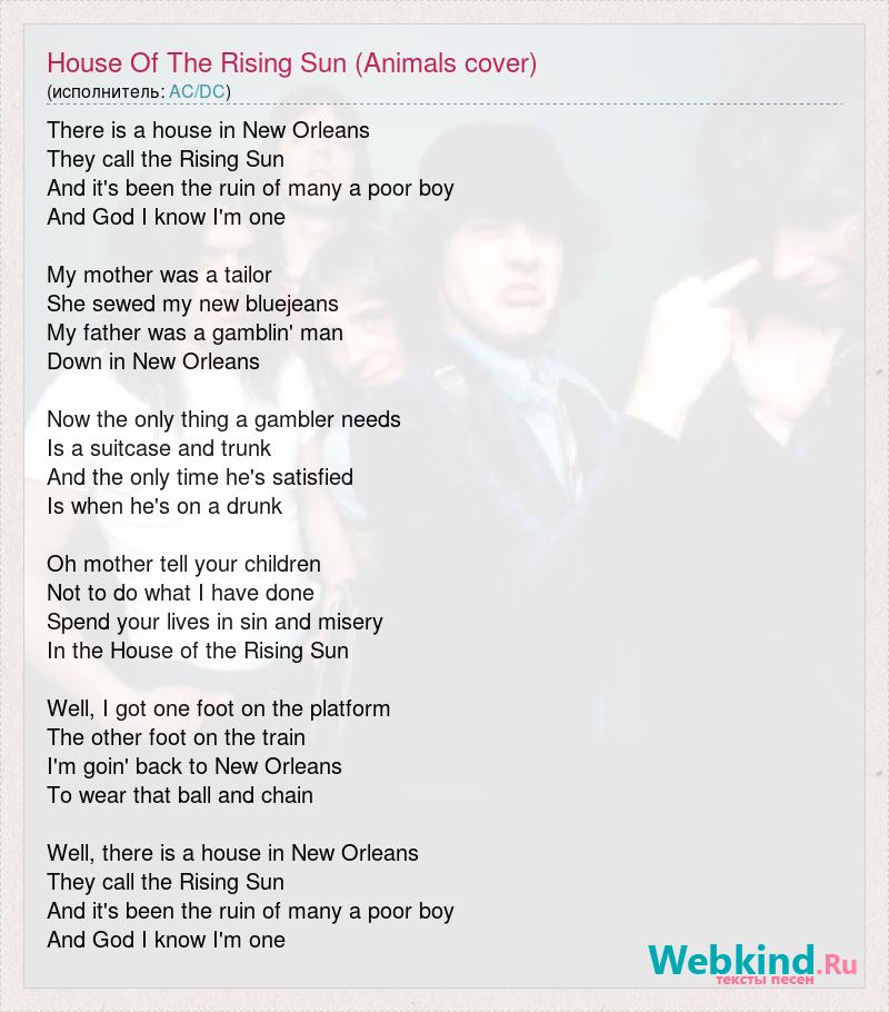 There is a house in New Orleans They call the Rising Sun And it's been the ruin of many a poor boy And God I know I'm one My mother was a tailor She sewed my new bluejeans My father was a gamblin' man Down in New Orleans Now the only thing a gambler needs Is a suitcase and trunk And the only time he's satisfied Is when he's on a drunk Oh mother tell your children Not to do what I have done Spend your lives in sin and misery In the House of the Rising Sun Well, I got one foot on the platform The other foot on the train I'm goin' back to New Orleans To wear that ball and chain Well, there is a house in New Orleans They call the Rising Sun And it's been the ruin of many a poor boy And God I know I'm one
