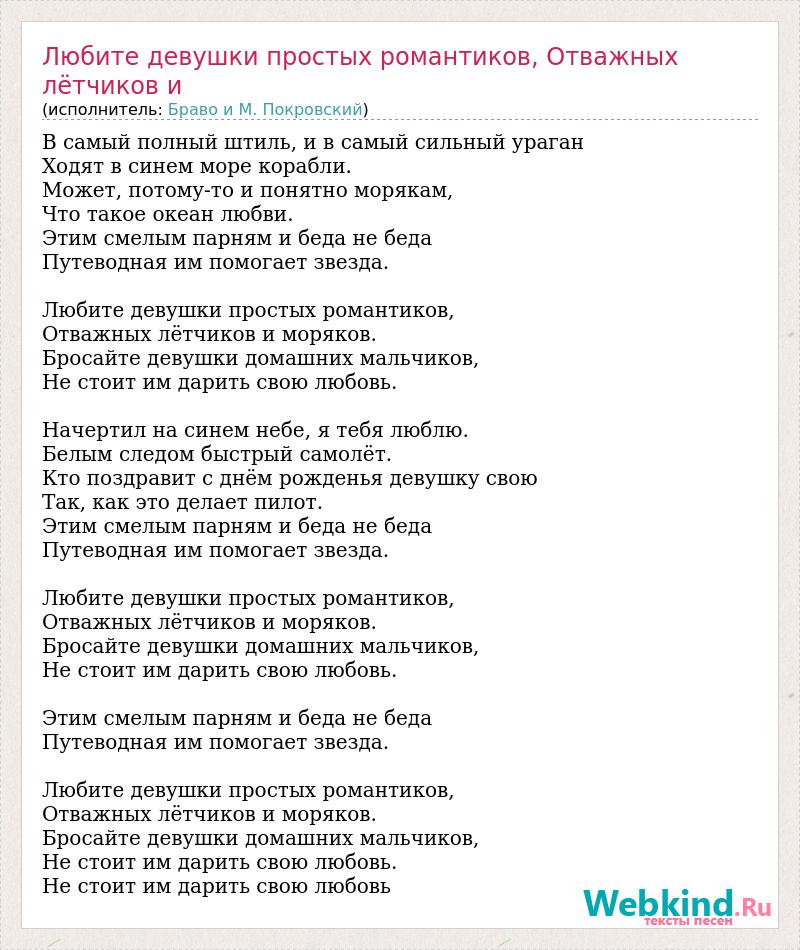 В самый полный штиль, и в самый сильный ураган Ходят в синем море корабли. Может, потому-то и понятно морякам, Что такое океан любви. Этим смелым парням и беда не беда Путеводная им помогает звезда. Любите девушки простых романтиков, Отважных лётчиков и моряков. Бросайте девушки домашних мальчиков, Не стоит им дарить свою любовь. Начертил на синем небе, я тебя люблю. Белым следом быстрый самолёт. Кто поздравит с днём рожденья девушку свою Так, как это делает пилот. Этим смелым парням и беда не беда Путеводная им помогает звезда. Любите девушки простых романтиков, Отважных лётчиков и моряков. Бросайте девушки домашних мальчиков, Не стоит им дарить свою любовь. Этим смелым парням и беда не беда Путеводная им помогает звезда. Любите девушки простых романтиков, Отважных лётчиков и моряков. Бросайте девушки домашних мальчиков, Не стоит им дарить свою любовь. Не стоит им дарить свою любовь