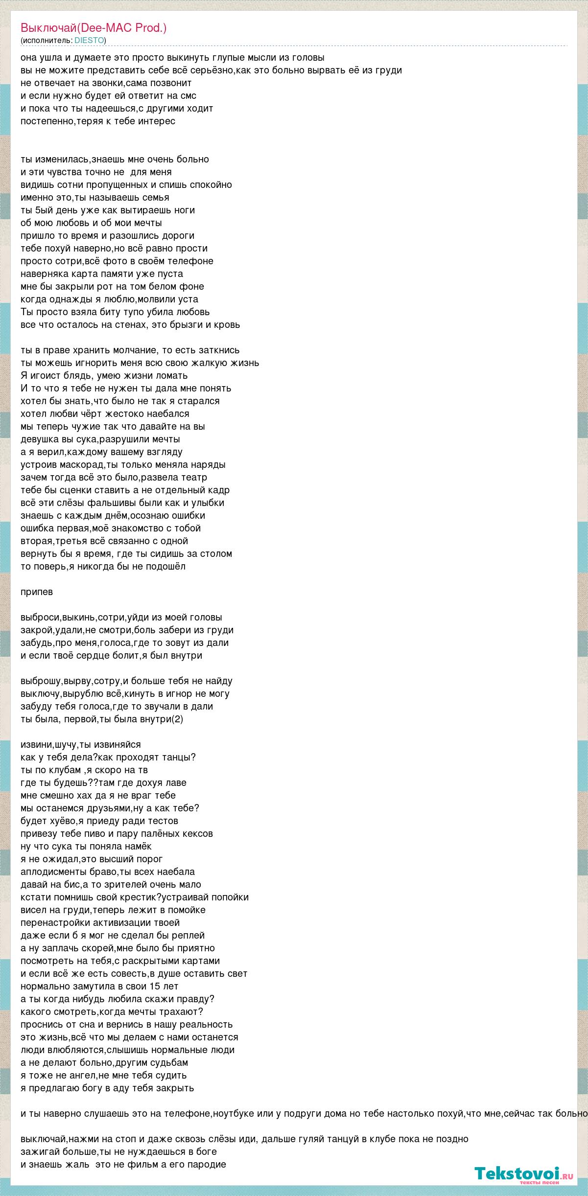 она ушла и думаете это просто выкинуть глупые мысли из головы вы не можите представить себе всё серьёзно,как это больно вырвать её из груди не отвечает на звонки,сама позвонит и если нужно будет ей ответит на смс и пока что ты надеешься,с другими ходит постепенно,теряя к тебе интерес ты изменилась,знаешь мне очень больно и эти чувства точно не для меня видишь сотни пропущенных и спишь спокойно именно это,ты называешь семья ты 5ый день уже как вытираешь ноги об мою любовь и об мои мечты пришло то время и разошлись дороги тебе похуй наверно,но всё равно прости просто сотри,всё фото в своём телефоне наверняка карта памяти уже пуста мне бы закрыли рот на том белом фоне когда однажды я люблю,молвили уста Ты просто взяла биту тупо убила любовь все что осталось на стенах, это брызги и кровь ты в праве хранить молчание, то есть заткнись ты можешь игнорить меня всю свою жалкую жизнь Я игоист блядь, умею жизни ломать И то что я тебе не нужен ты дала мне понять хотел бы знать,что было не так я старался хотел любви чёрт жестоко наебался мы теперь чужие так что давайте на вы девушка вы сука,разрушили мечты а я верил,каждому вашему взгляду устроив маскорад,ты только меняла наряды зачем тогда всё это было,развела театр тебе бы сценки ставить а не отдельный кадр всё эти слёзы фальшивы были как и улыбки знаешь с каждым днём,осознаю ошибки ошибка первая,моё знакомство с тобой вторая,третья всё связанно с одной вернуть бы я время, где ты сидишь за столом то поверь,я никогда бы не подошёл припев выброси,выкинь,сотри,уйди из моей головы закрой,удали,не смотри,боль забери из груди забудь,про меня,голоса,где то зовут из дали и если твоё сердце болит,я был внутри выброшу,вырву,сотру,и больше тебя не найду выключу,вырублю всё,кинуть в игнор не могу забуду тебя голоса,где то звучали в дали ты была, первой,ты была внутри(2) извини,шучу,ты извиняйся как у тебя дела?как проходят танцы? ты по клубам ,я скоро на тв где ты будешь??там где дохуя лаве мне смешно хах да я не враг тебе мы останемся друзьями,ну а как тебе? будет хуёво,я приеду ради тестов привезу тебе пиво и пару палёных кексов ну что сука ты поняла намёк я не ожидал,это высший порог аплодисменты браво,ты всех наебала давай на бис,а то зрителей очень мало кстати помнишь свой крестик?устраивай попойки висел на груди,теперь лежит в помойке перенастройки активизации твоей даже если б я мог не сделал бы реплей а ну заплачь скорей,мне было бы приятно посмотреть на тебя,с раскрытыми картами и если всё же есть совесть,в душе оставить свет нормально замутила в свои 15 лет а ты когда нибудь любила скажи правду? какого смотреть,когда мечты трахают? проснись от сна и вернись в нашу реальность это жизнь,всё что мы делаем с нами останется люди влюбляются,слышишь нормальные люди а не делают больно,другим судьбам я тоже не ангел,не мне тебя судить я предлагаю богу в аду тебя закрыть и ты наверно слушаешь это на телефоне,ноутбуке или у подруги дома но тебе настолько похуй,что мне,сейчас так больно выключай,нажми на стоп и даже сквозь слёзы иди, дальше гуляй танцуй в клубе пока не поздно зажигай больше,ты не нуждаешься в боге и знаешь жаль это не фильм а его пародие