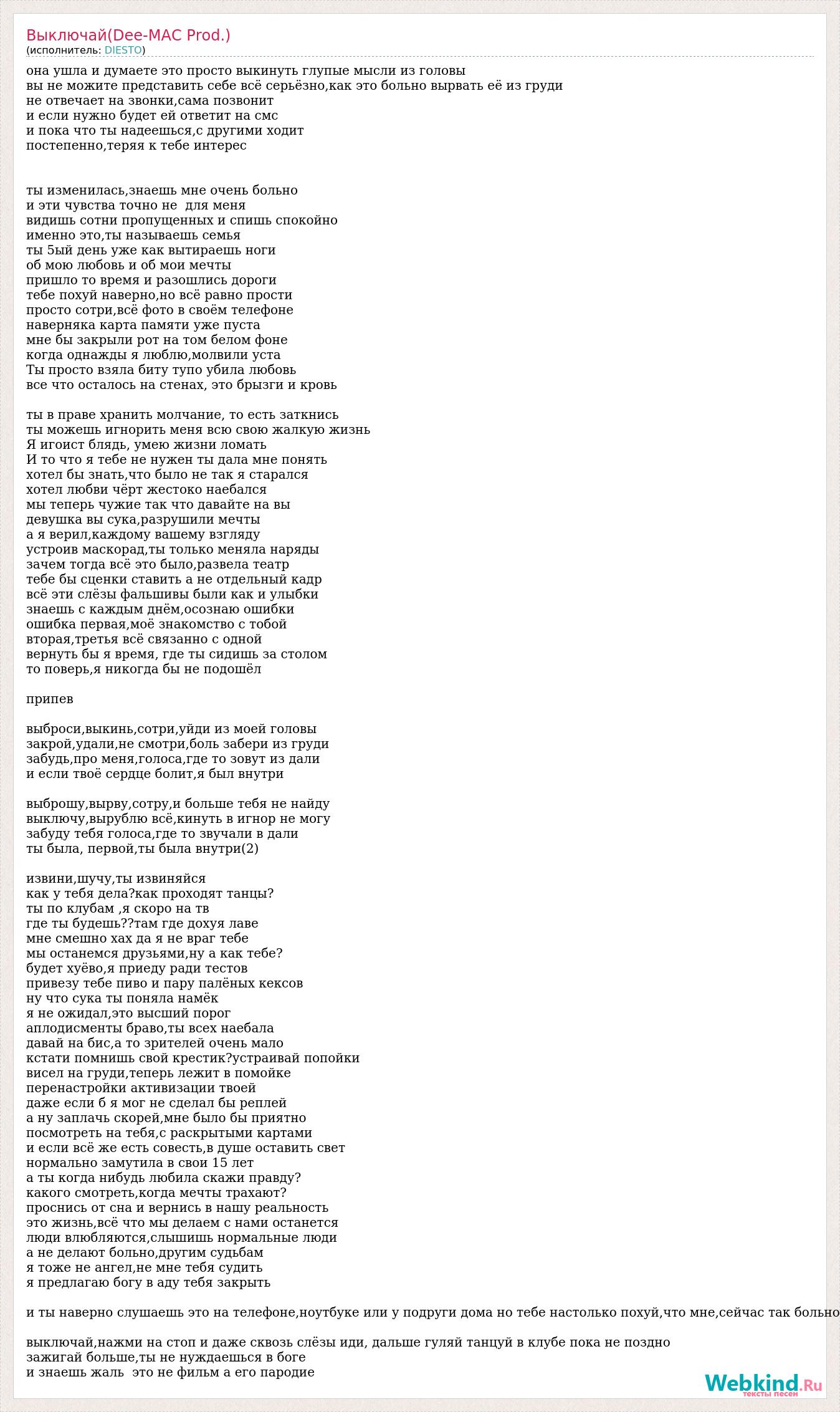 она ушла и думаете это просто выкинуть глупые мысли из головы вы не можите представить себе всё серьёзно,как это больно вырвать её из груди не отвечает на звонки,сама позвонит и если нужно будет ей ответит на смс и пока что ты надеешься,с другими ходит постепенно,теряя к тебе интерес ты изменилась,знаешь мне очень больно и эти чувства точно не для меня видишь сотни пропущенных и спишь спокойно именно это,ты называешь семья ты 5ый день уже как вытираешь ноги об мою любовь и об мои мечты пришло то время и разошлись дороги тебе похуй наверно,но всё равно прости просто сотри,всё фото в своём телефоне наверняка карта памяти уже пуста мне бы закрыли рот на том белом фоне когда однажды я люблю,молвили уста Ты просто взяла биту тупо убила любовь все что осталось на стенах, это брызги и кровь ты в праве хранить молчание, то есть заткнись ты можешь игнорить меня всю свою жалкую жизнь Я игоист блядь, умею жизни ломать И то что я тебе не нужен ты дала мне понять хотел бы знать,что было не так я старался хотел любви чёрт жестоко наебался мы теперь чужие так что давайте на вы девушка вы сука,разрушили мечты а я верил,каждому вашему взгляду устроив маскорад,ты только меняла наряды зачем тогда всё это было,развела театр тебе бы сценки ставить а не отдельный кадр всё эти слёзы фальшивы были как и улыбки знаешь с каждым днём,осознаю ошибки ошибка первая,моё знакомство с тобой вторая,третья всё связанно с одной вернуть бы я время, где ты сидишь за столом то поверь,я никогда бы не подошёл припев выброси,выкинь,сотри,уйди из моей головы закрой,удали,не смотри,боль забери из груди забудь,про меня,голоса,где то зовут из дали и если твоё сердце болит,я был внутри выброшу,вырву,сотру,и больше тебя не найду выключу,вырублю всё,кинуть в игнор не могу забуду тебя голоса,где то звучали в дали ты была, первой,ты была внутри(2) извини,шучу,ты извиняйся как у тебя дела?как проходят танцы? ты по клубам ,я скоро на тв где ты будешь??там где дохуя лаве мне смешно хах да я не враг тебе мы останемся друзьями,ну а как тебе? будет хуёво,я приеду ради тестов привезу тебе пиво и пару палёных кексов ну что сука ты поняла намёк я не ожидал,это высший порог аплодисменты браво,ты всех наебала давай на бис,а то зрителей очень мало кстати помнишь свой крестик?устраивай попойки висел на груди,теперь лежит в помойке перенастройки активизации твоей даже если б я мог не сделал бы реплей а ну заплачь скорей,мне было бы приятно посмотреть на тебя,с раскрытыми картами и если всё же есть совесть,в душе оставить свет нормально замутила в свои 15 лет а ты когда нибудь любила скажи правду? какого смотреть,когда мечты трахают? проснись от сна и вернись в нашу реальность это жизнь,всё что мы делаем с нами останется люди влюбляются,слышишь нормальные люди а не делают больно,другим судьбам я тоже не ангел,не мне тебя судить я предлагаю богу в аду тебя закрыть и ты наверно слушаешь это на телефоне,ноутбуке или у подруги дома но тебе настолько похуй,что мне,сейчас так больно выключай,нажми на стоп и даже сквозь слёзы иди, дальше гуляй танцуй в клубе пока не поздно зажигай больше,ты не нуждаешься в боге и знаешь жаль это не фильм а его пародие