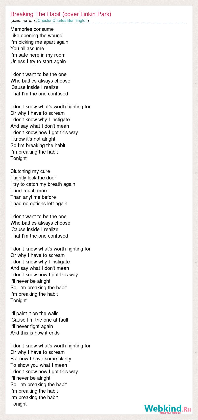 Memories consume Like opening the wound I'm picking me apart again You all assume I'm safe here in my room Unless I try to start again I don't want to be the one Who battles always choose 'Cause inside I realize That I'm the one confused I don't know what's worth fighting for Or why I have to scream I don't know why I instigate And say what I don't mean I don't know how I got this way I know it's not alright So I'm breaking the habit I'm breaking the habit Tonight Clutching my cure I tightly lock the door I try to catch my breath again I hurt much more Than anytime before I had no options left again I don't want to be the one Who battles always choose 'Cause inside I realize That I'm the one confused I don't know what's worth fighting for Or why I have to scream I don't know why I instigate And say what I don't mean I don't know how I got this way I'll never be alright So, I'm breaking the habit I'm breaking the habit Tonight I'll paint it on the walls 'Cause I'm the one at fault I'll never fight again And this is how it ends I don't know what's worth fighting for Or why I have to scream But now I have some clarity To show you what I mean I don't know how I got this way I'll never be alright So, I'm breaking the habit I'm breaking the habit I'm breaking the habit Tonight