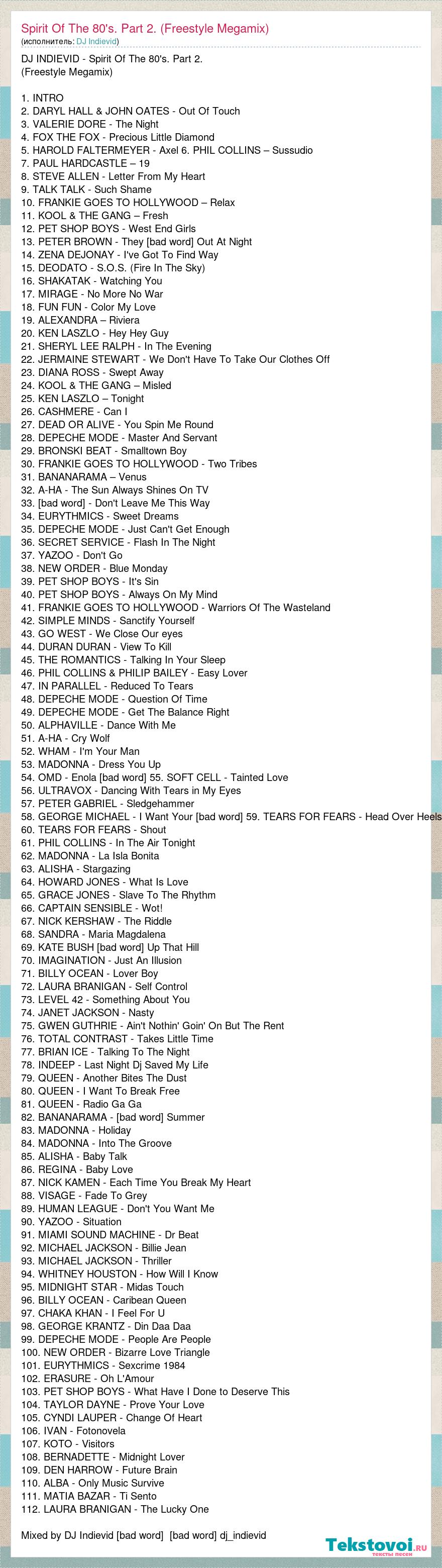 DJ INDIEVID - Spirit Of The 80's. Part 2. (Freestyle Megamix) 1. INTRO 2. DARYL HALL & JOHN OATES - Out Of Touch 3. VALERIE DORE - The Night 4. FOX THE FOX - Precious Little Diamond 5. HAROLD FALTERMEYER - Axel 6. PHIL COLLINS – Sussudio 7. PAUL HARDCASTLE – 19 8. STEVE ALLEN - Letter From My Heart 9. TALK TALK - Such Shame 10. FRANKIE GOES TO HOLLYWOOD – Relax 11. KOOL & THE GANG – Fresh 12. PET SHOP BOYS - West End Girls 13. PETER BROWN - They Only Come Out At Night 14. ZENA DEJONAY - I've Got To Find Way 15. DEODATO - S.O.S. (Fire In The Sky) 16. SHAKATAK - Watching You 17. MIRAGE - No More No War 18. FUN FUN - Color My Love 19. ALEXANDRA – Riviera 20. KEN LASZLO - Hey Hey Guy 21. SHERYL LEE RALPH - In The Evening 22. JERMAINE STEWART - We Don't Have To Take Our Clothes Off 23. DIANA ROSS - Swept Away 24. KOOL & THE GANG – Misled 25. KEN LASZLO – Tonight 26. CASHMERE - Can I 27. DEAD OR ALIVE - You Spin Me Round 28. DEPECHE MODE - Master And Servant 29. BRONSKI BEAT - Smalltown Boy 30. FRANKIE GOES TO HOLLYWOOD - Two Tribes 31. BANANARAMA – Venus 32. A-HA - The Sun Always Shines On TV 33. THE COMMUNARDS - Don't Leave Me This Way 34. EURYTHMICS - Sweet Dreams 35. DEPECHE MODE - Just Can't Get Enough 36. SECRET SERVICE - Flash In The Night 37. YAZOO - Don't Go 38. NEW ORDER - Blue Monday 39. PET SHOP BOYS - It's Sin 40. PET SHOP BOYS - Always On My Mind 41. FRANKIE GOES TO HOLLYWOOD - Warriors Of The Wasteland 42. SIMPLE MINDS - Sanctify Yourself 43. GO WEST - We Close Our eyes 44. DURAN DURAN - View To Kill 45. THE ROMANTICS - Talking In Your Sleep 46. PHIL COLLINS & PHILIP BAILEY - Easy Lover 47. IN PARALLEL - Reduced To Tears 48. DEPECHE MODE - Question Of Time 49. DEPECHE MODE - Get The Balance Right 50. ALPHAVILLE - Dance With Me 51. A-HA - Cry Wolf 52. WHAM - I'm Your Man 53. MADONNA - Dress You Up 54. OMD - Enola [bad word] 55. SOFT CELL - Tainted Love 56. ULTRAVOX - Dancing With Tears in My Eyes 57. PETER GABRIEL - Sledgehammer 58. GEORGE MICHAEL - I Want Your [bad word] 59. TEARS FOR FEARS - Head Over Heels 60. TEARS FOR FEARS - Shout 61. PHIL COLLINS - In The Air Tonight 62. MADONNA - La Isla Bonita 63. ALISHA - Stargazing 64. HOWARD JONES - What Is Love 65. GRACE JONES - Slave To The Rhythm 66. CAPTAIN SENSIBLE - Wot! 67. NICK KERSHAW - The Riddle 68. SANDRA - Maria Magdalena 69. KATE BUSH - Runnig Up That Hill 70. IMAGINATION - Just An Illusion 71. BILLY OCEAN - Lover Boy 72. LAURA BRANIGAN - Self Control 73. LEVEL 42 - Something About You 74. JANET JACKSON - Nasty 75. GWEN GUTHRIE - Ain't Nothin' Goin' On But The Rent 76. TOTAL CONTRAST - Takes Little Time 77. BRIAN ICE - Talking To The Night 78. INDEEP - Last Night Dj Saved My Life 79. QUEEN - Another Bites The Dust 80. QUEEN - I Want To Break Free 81. QUEEN - Radio Ga Ga 82. BANANARAMA - Cruel Summer 83. MADONNA - Holiday 84. MADONNA - Into The Groove 85. ALISHA - Baby Talk 86. REGINA - Baby Love 87. NICK KAMEN - Each Time You Break My Heart 88. VISAGE - Fade To Grey 89. HUMAN LEAGUE - Don't You Want Me 90. YAZOO - Situation 91. MIAMI SOUND MACHINE - Dr Beat 92. MICHAEL JACKSON - Billie Jean 93. MICHAEL JACKSON - Thriller 94. WHITNEY HOUSTON - How Will I Know 95. MIDNIGHT STAR - Midas Touch 96. BILLY OCEAN - Caribean Queen 97. CHAKA KHAN - I Feel For U 98. GEORGE KRANTZ - Din Daa Daa 99. DEPECHE MODE - People Are People 100. NEW ORDER - Bizarre Love Triangle 101. EURYTHMICS - Sexcrime 1984 102. ERASURE - Oh L'Amour 103. PET SHOP BOYS - What Have I Done to Deserve This 104. TAYLOR DAYNE - Prove Your Love 105. CYNDI LAUPER - Change Of Heart 106. IVAN - Fotonovela 107. KOTO - Visitors 108. BERNADETTE - Midnight Lover 109. DEN HARROW - Future Brain 110. ALBA - Only Music Survive 111. MATIA BAZAR - Ti Sento 112. LAURA BRANIGAN - The Lucky One Mixed by DJ Indievid [bad word] [bad word] dj_indievid