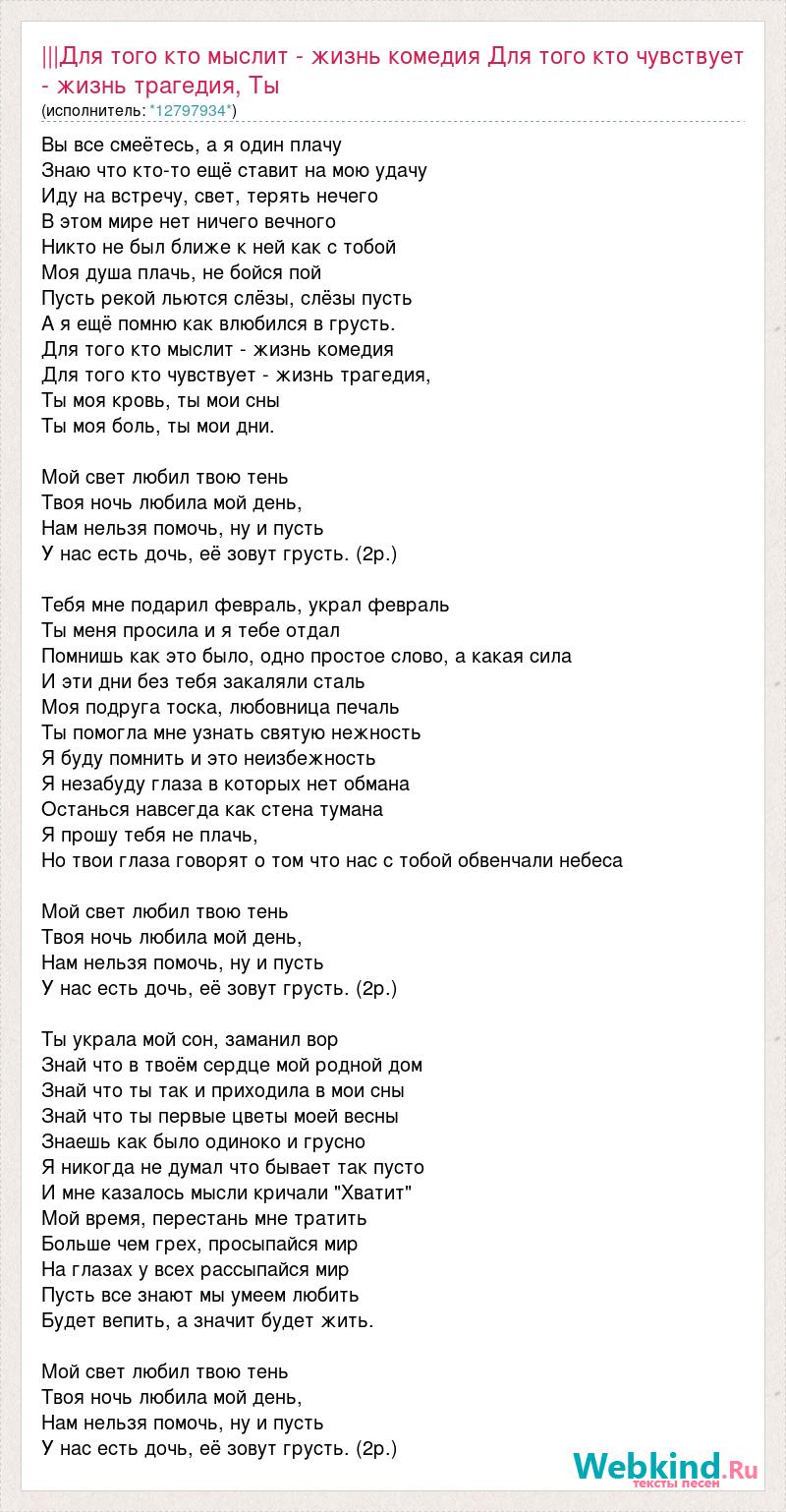 Вы все смеётесь, а я один плачу Знаю что кто-то ещё ставит на мою удачу Иду на встречу, свет, терять нечего В этом мире нет ничего вечного Никто не был ближе к ней как с тобой Моя душа плачь, не бойся пой Пусть рекой льются слёзы, слёзы пусть А я ещё помню как влюбился в грусть. Для того кто мыслит - жизнь комедия Для того кто чувствует - жизнь трагедия, Ты моя кровь, ты мои сны Ты моя боль, ты мои дни. Мой свет любил твою тень Твоя ночь любила мой день, Нам нельзя помочь, ну и пусть У нас есть дочь, её зовут грусть. (2р.) Тебя мне подарил февраль, украл февраль Ты меня просила и я тебе отдал Помнишь как это было, одно простое слово, а какая сила И эти дни без тебя закаляли сталь Моя подруга тоска, любовница печаль Ты помогла мне узнать святую нежность Я буду помнить и это неизбежность Я незабуду глаза в которых нет обмана Останься навсегда как стена тумана Я прошу тебя не плачь, Но твои глаза говорят о том что нас с тобой обвенчали небеса Мой свет любил твою тень Твоя ночь любила мой день, Нам нельзя помочь, ну и пусть У нас есть дочь, её зовут грусть. (2р.) Ты украла мой сон, заманил вор Знай что в твоём сердце мой родной дом Знай что ты так и приходила в мои сны Знай что ты первые цветы моей весны Знаешь как было одиноко и грусно Я никогда не думал что бывает так пусто И мне казалось мысли кричали "Хватит" Мой время, перестань мне тратить Больше чем грех, просыпайся мир На глазах у всех рассыпайся мир Пусть все знают мы умеем любить Будет вепить, а значит будет жить. Мой свет любил твою тень Твоя ночь любила мой день, Нам нельзя помочь, ну и пусть У нас есть дочь, её зовут грусть. (2р.)
