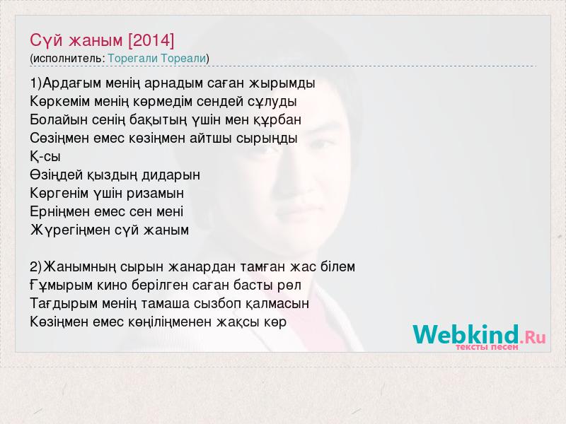 1)Ардағым менің арнадым саған жырымды Көркемім менің көрмедім сендей сұлуды Болайын сенің бақытың үшін мен құрбан Сөзіңмен емес көзіңмен айтшы сырыңды Қ-сы Өзіңдей қыздың дидарын Көргенім үшін ризамын Ерніңмен емес сен мені Жүрегіңмен сүй жаным 2)Жанымның сырын жанардан тамған жас білем Ғұмырым кино берілген саған басты рөл Тағдырым менің тамаша сызбоп қалмасын Көзіңмен емес көңіліңменен жақсы көр