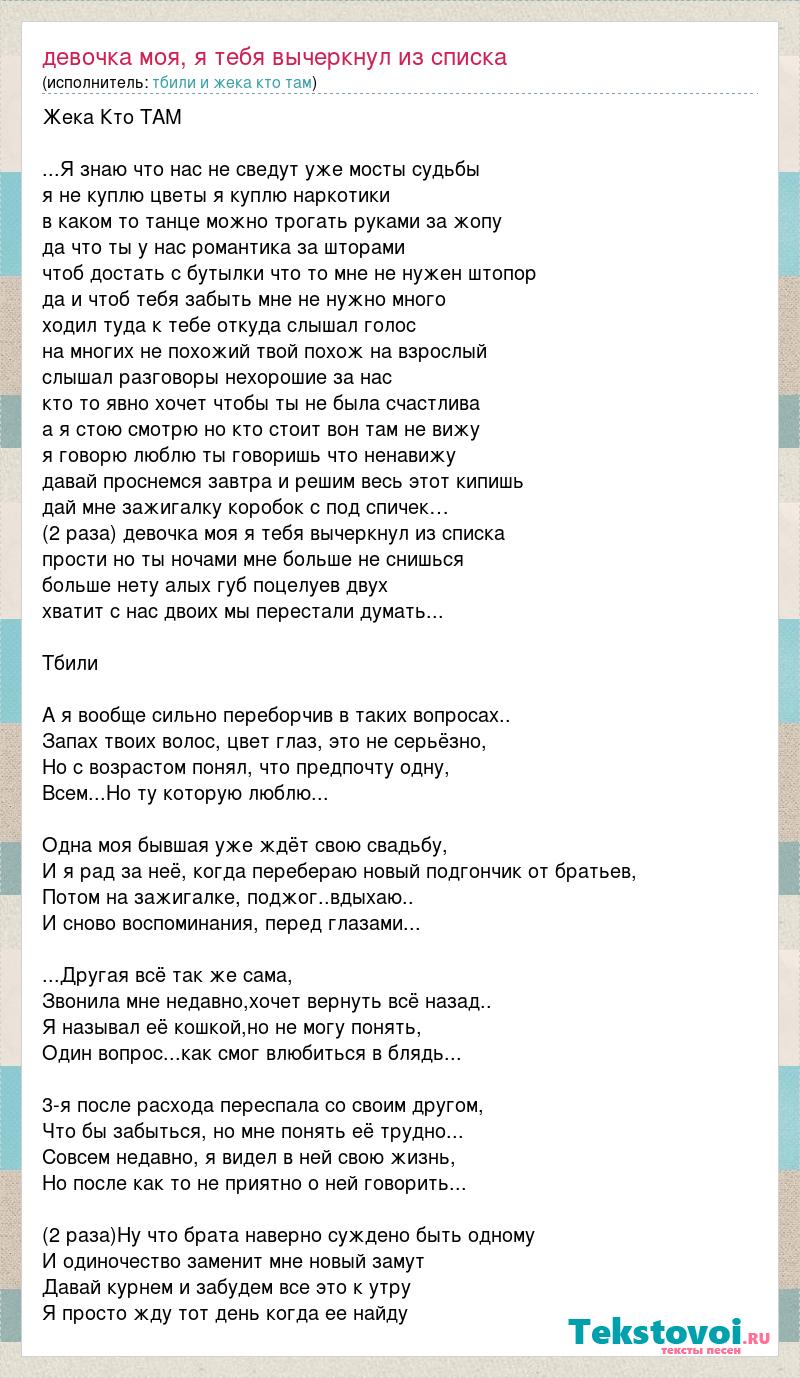 Жека Кто ТАМ ...Я знаю что нас не сведут уже мосты судьбы я не куплю цветы я куплю наркотики в каком то танце можно трогать руками за жопу да что ты у нас романтика за шторами чтоб достать с бутылки что то мне не нужен штопор да и чтоб тебя забыть мне не нужно много ходил туда к тебе откуда слышал голос на многих не похожий твой похож на взрослый слышал разговоры нехорошие за нас кто то явно хочет чтобы ты не была счастлива а я стою смотрю но кто стоит вон там не вижу я говорю люблю ты говоришь что ненавижу давай проснемся завтра и решим весь этот кипишь дай мне зажигалку коробок с под спичек… (2 раза) девочка моя я тебя вычеркнул из списка прости но ты ночами мне больше не снишься больше нету алых губ поцелуев двух хватит с нас двоих мы перестали думать... Тбили А я вообще сильно переборчив в таких вопросах.. Запах твоих волос, цвет глаз, это не серьёзно, Но с возрастом понял, что предпочту одну, Всем...Но ту которую люблю... Одна моя бывшая уже ждёт свою свадьбу, И я рад за неё, когда перебераю новый подгончик от братьев, Потом на зажигалке, поджог..вдыхаю.. И сново воспоминания, перед глазами... ...Другая всё так же сама, Звонила мне недавно,хочет вернуть всё назад.. Я называл её кошкой,но не могу понять, Один вопрос...как смог влюбиться в блядь... 3-я после расхода переспала со своим другом, Что бы забыться, но мне понять её трудно... Совсем недавно, я видел в ней свою жизнь, Но после как то не приятно о ней говорить... (2 раза)Ну что брата наверно суждено быть одному И одиночество заменит мне новый замут Давай курнем и забудем все это к утру Я просто жду тот день когда ее найду