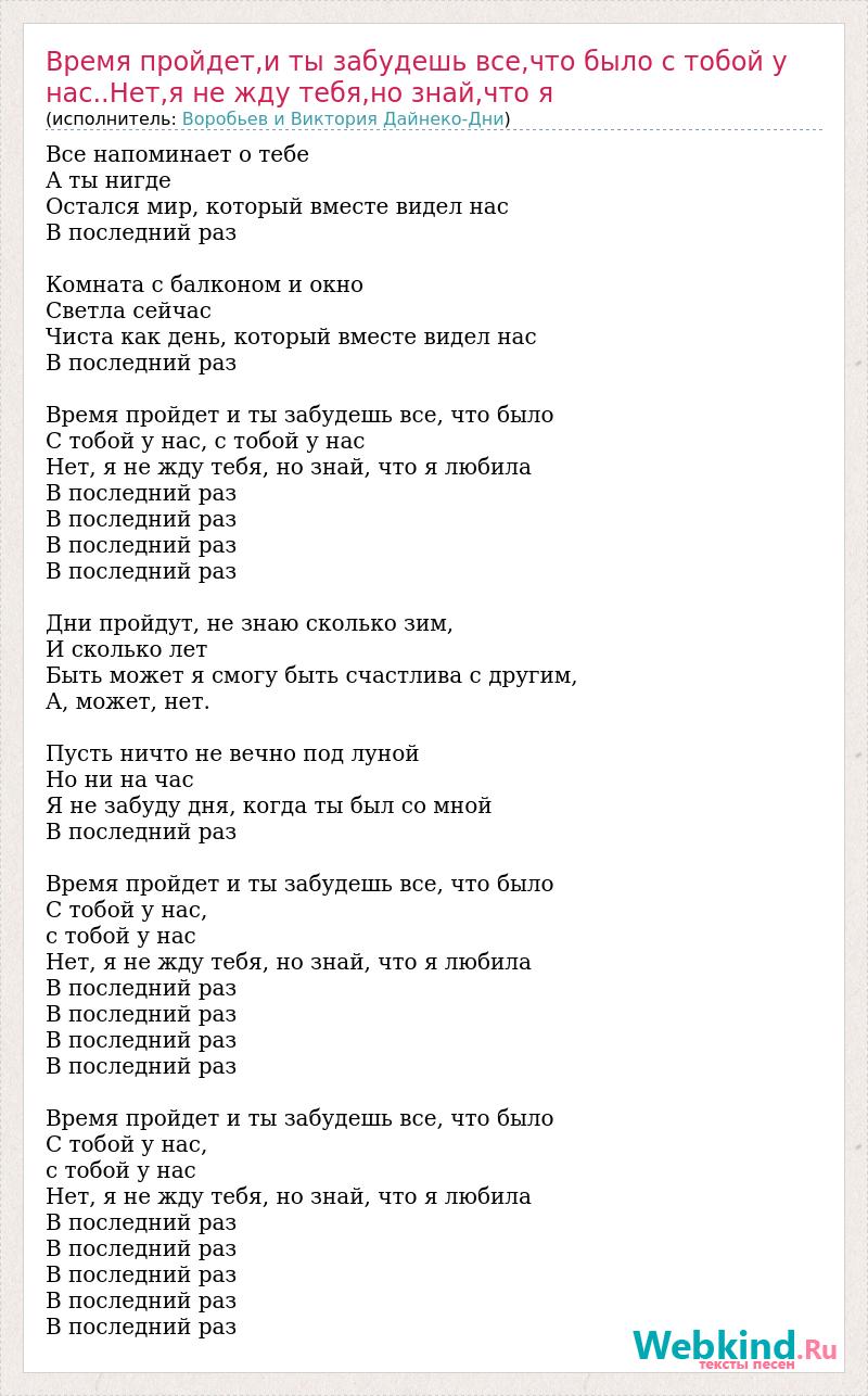 Главная→Исполнители→Воробьев и Виктория Дайнеко-Дни→Время пройдет,и ты забудешь все,что было с тобой у нас..Нет,я не жду тебя