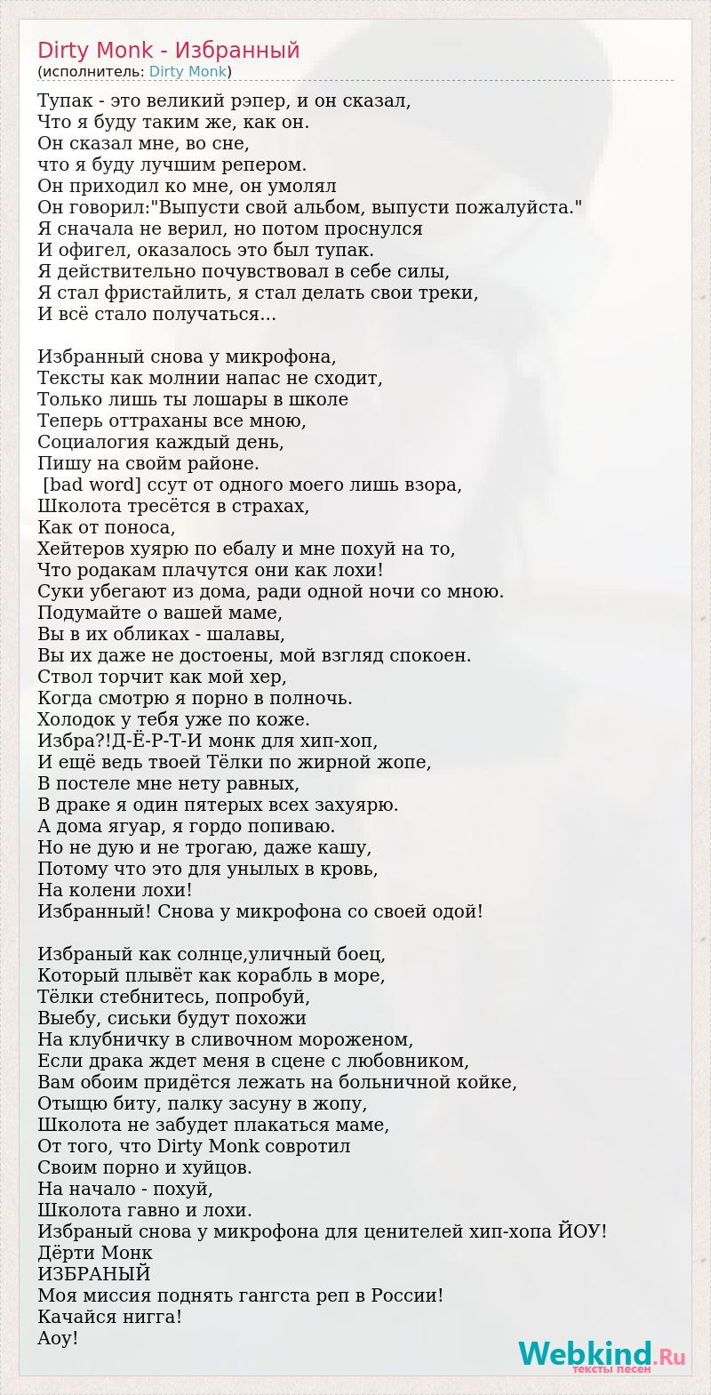 Тупак - это великий рэпер, и он сказал, Что я буду таким же, как он. Он сказал мне, во сне, что я буду лучшим репером. Он приходил ко мне, он умолял Он говорил:"Выпусти свой альбом, выпусти пожалуйста." Я сначала не верил, но потом проснулся И офигел, оказалось это был тупак. Я действительно почувствовал в себе силы, Я стал фристайлить, я стал делать свои треки, И всё стало получаться... Избранный снова у микрофона, Тексты как молнии напас не сходит, Только лишь ты лошары в школе Теперь оттраханы все мною, Социалогия каждый день, Пишу на свойм районе. [bad word] ссут от одного моего лишь взора, Школота тресётся в страхах, Как от поноса, Хейтеров хуярю по ебалу и мне похуй на то, Что родакам плачутся они как лохи! Суки убегают из дома, ради одной ночи со мною. Подумайте о вашей маме, Вы в их обликах - шалавы, Вы их даже не достоены, мой взгляд спокоен. Ствол торчит как мой хер, Когда смотрю я порно в полночь. Холодок у тебя уже по коже. Избра?!Д-Ё-Р-Т-И монк для хип-хоп, И ещё ведь твоей Тёлки по жирной жопе, В постеле мне нету равных, В драке я один пятерых всех захуярю. А дома ягуар, я гордо попиваю. Но не дую и не трогаю, даже кашу, Потому что это для унылых в кровь, На колени лохи! Избранный! Снова у микрофона со своей одой! Избраный как солнце,уличный боец, Который плывёт как корабль в море, Тёлки стебнитесь, попробуй, Выебу, сиськи будут похожи На клубничку в сливочном мороженом, Если драка ждет меня в сцене с любовником, Вам обоим придётся лежать на больничной койке, Отыщю биту, палку засуну в жопу, Школота не забудет плакаться маме, От того, что Dirty Monk совротил Своим порно и хуйцов. На начало - похуй, Школота гавно и лохи. Избраный снова у микрофона для ценителей хип-хопа ЙОУ! Дёрти Монк ИЗБРАНЫЙ Моя миссия поднять гангста реп в России! Качайся нигга! Аоу!