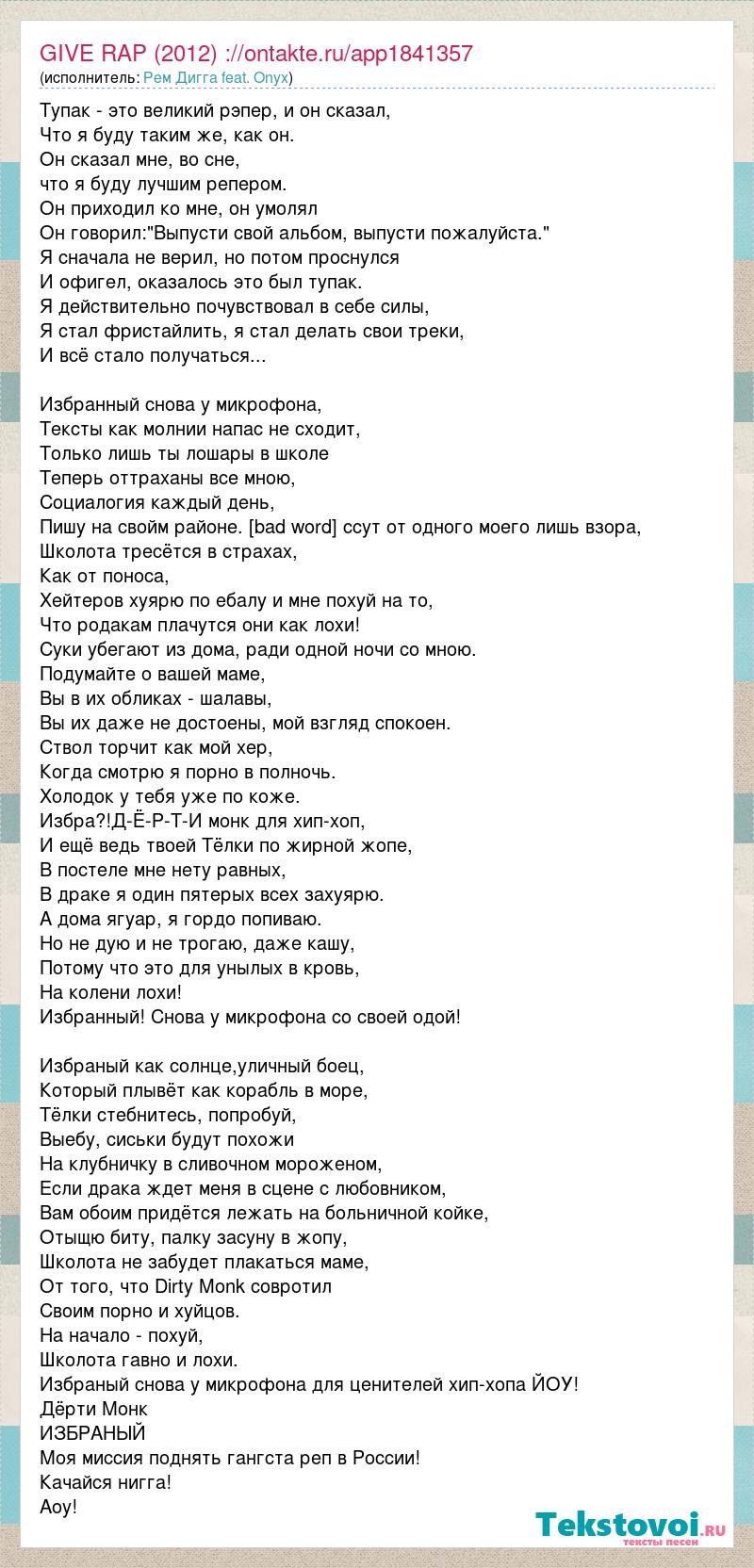 Тупак - это великий рэпер, и он сказал, Что я буду таким же, как он. Он сказал мне, во сне, что я буду лучшим репером. Он приходил ко мне, он умолял Он говорил:"Выпусти свой альбом, выпусти пожалуйста." Я сначала не верил, но потом проснулся И офигел, оказалось это был тупак. Я действительно почувствовал в себе силы, Я стал фристайлить, я стал делать свои треки, И всё стало получаться... Избранный снова у микрофона, Тексты как молнии напас не сходит, Только лишь ты лошары в школе Теперь оттраханы все мною, Социалогия каждый день, Пишу на свойм районе. [bad word] ссут от одного моего лишь взора, Школота тресётся в страхах, Как от поноса, Хейтеров хуярю по ебалу и мне похуй на то, Что родакам плачутся они как лохи! Суки убегают из дома, ради одной ночи со мною. Подумайте о вашей маме, Вы в их обликах - шалавы, Вы их даже не достоены, мой взгляд спокоен. Ствол торчит как мой хер, Когда смотрю я порно в полночь. Холодок у тебя уже по коже. Избра?!Д-Ё-Р-Т-И монк для хип-хоп, И ещё ведь твоей Тёлки по жирной жопе, В постеле мне нету равных, В драке я один пятерых всех захуярю. А дома ягуар, я гордо попиваю. Но не дую и не трогаю, даже кашу, Потому что это для унылых в кровь, На колени лохи! Избранный! Снова у микрофона со своей одой! Избраный как солнце,уличный боец, Который плывёт как корабль в море, Тёлки стебнитесь, попробуй, Выебу, сиськи будут похожи На клубничку в сливочном мороженом, Если драка ждет меня в сцене с любовником, Вам обоим придётся лежать на больничной койке, Отыщю биту, палку засуну в жопу, Школота не забудет плакаться маме, От того, что Dirty Monk совротил Своим порно и хуйцов. На начало - похуй, Школота гавно и лохи. Избраный снова у микрофона для ценителей хип-хопа ЙОУ! Дёрти Монк ИЗБРАНЫЙ Моя миссия поднять гангста реп в России! Качайся нигга! Аоу!