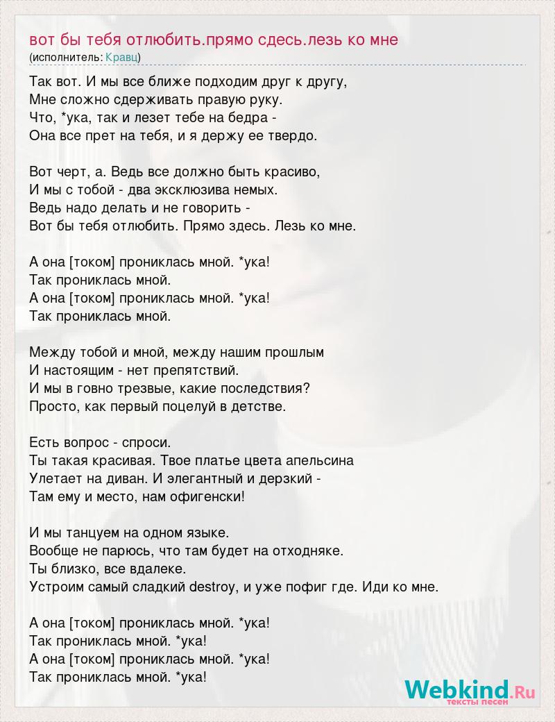 Так вот. И мы все ближе подходим друг к другу, Мне сложно сдерживать правую руку. Что, *ука, так и лезет тебе на бедра - Она все прет на тебя, и я держу ее твердо. Вот черт, а. Ведь все должно быть красиво, И мы с тобой - два эксклюзива немых. Ведь надо делать и не говорить - Вот бы тебя отлюбить. Прямо здесь. Лезь ко мне. А она [током] прониклась мной. *ука! Так прониклась мной. А она [током] прониклась мной. *ука! Так прониклась мной. Между тобой и мной, между нашим прошлым И настоящим - нет препятствий. И мы в говно трезвые, какие последствия? Просто, как первый поцелуй в детстве. Есть вопрос - спроси. Ты такая красивая. Твое платье цвета апельсина Улетает на диван. И элегантный и дерзкий - Там ему и место, нам офигенски! И мы танцуем на одном языке. Вообще не парюсь, что там будет на отходняке. Ты близко, все вдалеке. Устроим самый сладкий destroy, и уже пофиг где. Иди ко мне. А она [током] прониклась мной. *ука! Так прониклась мной. *ука! А она [током] прониклась мной. *ука! Так прониклась мной. *ука!