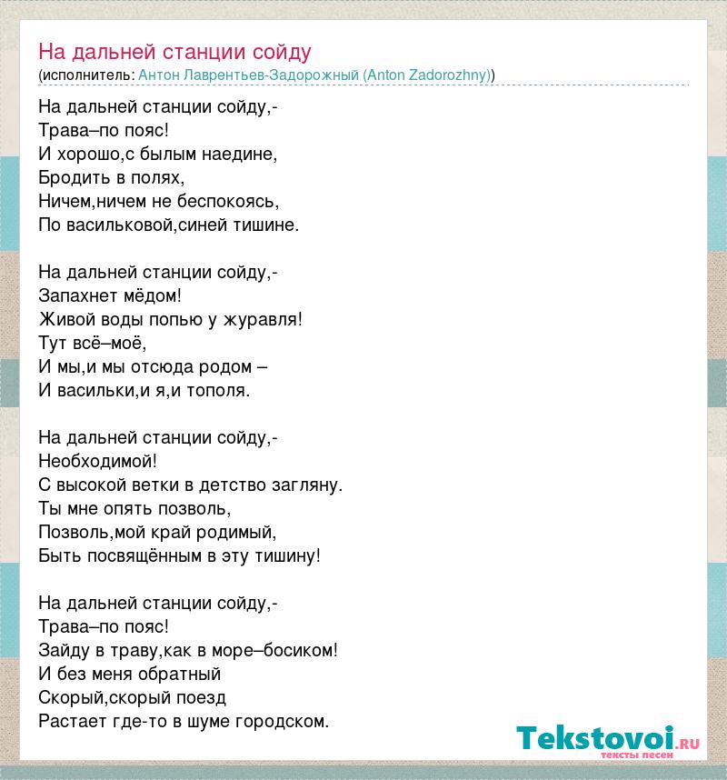 На дальней станции сойду,- Трава–по пояс! И хорошо,с былым наедине, Бродить в полях, Ничем,ничем не беспокоясь, По васильковой,синей тишине. На дальней станции сойду,- Запахнет мёдом! Живой воды попью у журавля! Тут всё–моё, И мы,и мы отсюда родом – И васильки,и я,и тополя. На дальней станции сойду,- Необходимой! С высокой ветки в детство загляну. Ты мне опять позволь, Позволь,мой край родимый, Быть посвящённым в эту тишину! На дальней станции сойду,- Трава–по пояс! Зайду в траву,как в море–босиком! И без меня обратный Скорый,скорый поезд Растает где-то в шуме городском.