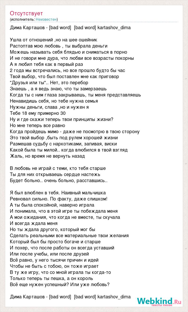 Дима Карташов - [bad word] [bad word] kartashov_dima Ушла от отношений ,но на шее ошейник Растоптав мою любовь , ты выбрала деньги Можешь называть себя блядью и сниматься в порно И не говори мне дура, что любви все возрасты покорны А я любил тебя как в первый раз 2 года мы встречались, но все прошло будто бы час Твой выбор, что был поставлен мне как приговор "Друзья или ты".. Нет, это перебор Знаешь , а я ведь знаю, что ты замерзаешь Когда ты с ним глаза закрываешь, ты меня представляешь Ненавидишь себя, но тебе нужна семья Нужны деньги, слава ,но и нужен я Тебе 18 ему примерно 30 Ну и где скажи теперь твои принципы жизни? Но мне теперь все равно Когда пройдешь мимо - даже не посмотрю в твою сторону Это твой выбор ,быть под рулем хорошей жизни Размешав судьбу с наркотиками, запивая, виски Какой была ты милой.. когда влюбился в твой взгляд Жаль, но время не вернуть назад В любовь не играй с теми, кто тебя старше Ты для них открываешь сердце настежь Будет больно.. очень больно, расставшись.. Я был влюблен в тебя. Наивный мальчишка Ревновал сильно. По факту, даже слишком! А ты была спокойной, наверно играла И понимала, что в этой игре ты побеждала меня А мои ожидания, что когда не вместе, ты скучала И всегда ждала меня Но ты ждала другого, который мог бы Сделать реальными все материальные твои желания Который был бы просто богаче и старше И похер, что после работы он всегда уставший Или после учебы, или после друзей Всё равно, у него тысячи причин и идей Чтобы не быть с тобою, он тоже играет В ту же игру, что со мной играла ты когда-то Только теперь ты пешка, а он король Всё еще нужен успешный? Или уже любовь? Дима Карташов - [bad word] [bad word] kartashov_dima